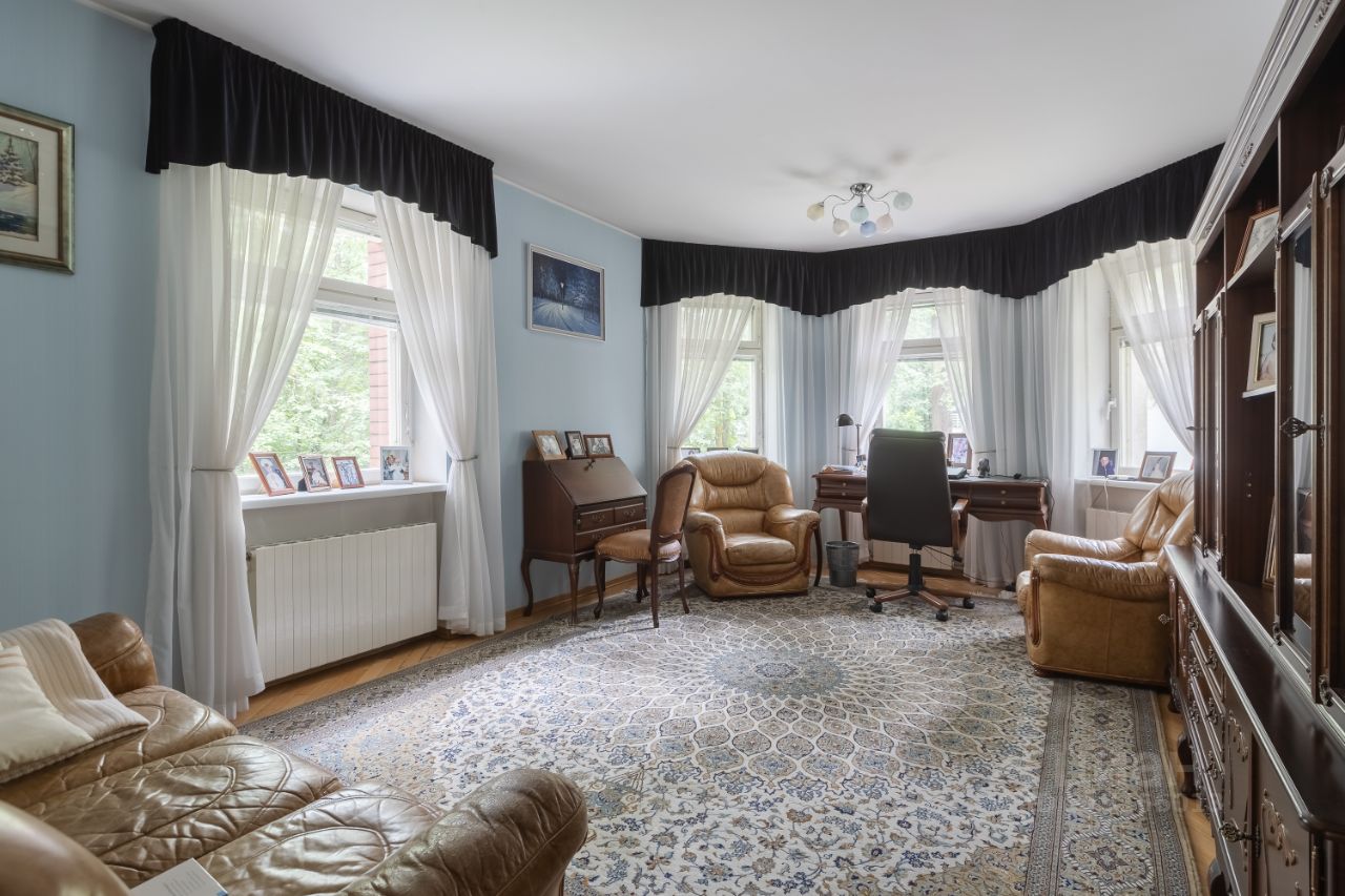 Предлагается к покупке загородный дом на лесном земельном участке, расположенном в уникальном КП Пансионат Петрово-Дальнее в 15 км от Москвы. Земельный участок 30 соток правильной прямоугольной формы с лесным ландшафтом, взрослыми деревьями. На участке расположены 3 дома: основной 1995 года постройки — 380 м2 и гостевой дом с баней 2021 года постройки -- 140 м2 и дом для персонала — 40 м2. Основной дом имеет подземный паркинг, построен из кирпича, крыша мягкая кровля, фундамент монолит. Планировка: 1 этаж: кухня-столовая, гостиная, каминный зал, санузел, выход на террасу и к летнему бассейну, 2 этаж: 4 спальни, 2 санузла, 3 этаж: помещение свободного назначения, Подвал: подземный паркинг на 1 автомобиль, топочная. Баня выполнена из деревянного сруба 2021 года постройки, мягкая кровля, монолитный фундамент. Планировка: 1 этаж: парилка, топочная, комната отдыха, кухня, гостиная, санузел, 2 этаж: спальня, санузел, бильярдная комната Также на 1 этаже с отдельным входом размещена квартира для персонала. К основному дому примыкает бассейн с обогревом. О поселке: поселок расположен на территории усадьбы Петровское среди лесного, где сливаются 2 реки: р. Истра и Москва-река, это территория пансионата Управления делами Предзидента РФ, 60 гА отведено под зону отдыха — это и современный комплекс с бассейном и спа, и ресторан, и школа верховой езды, и теннисный корт, и прогулочные зоны вдоль реки. У поселка строгий пропускной режим и профессиональная охрана.