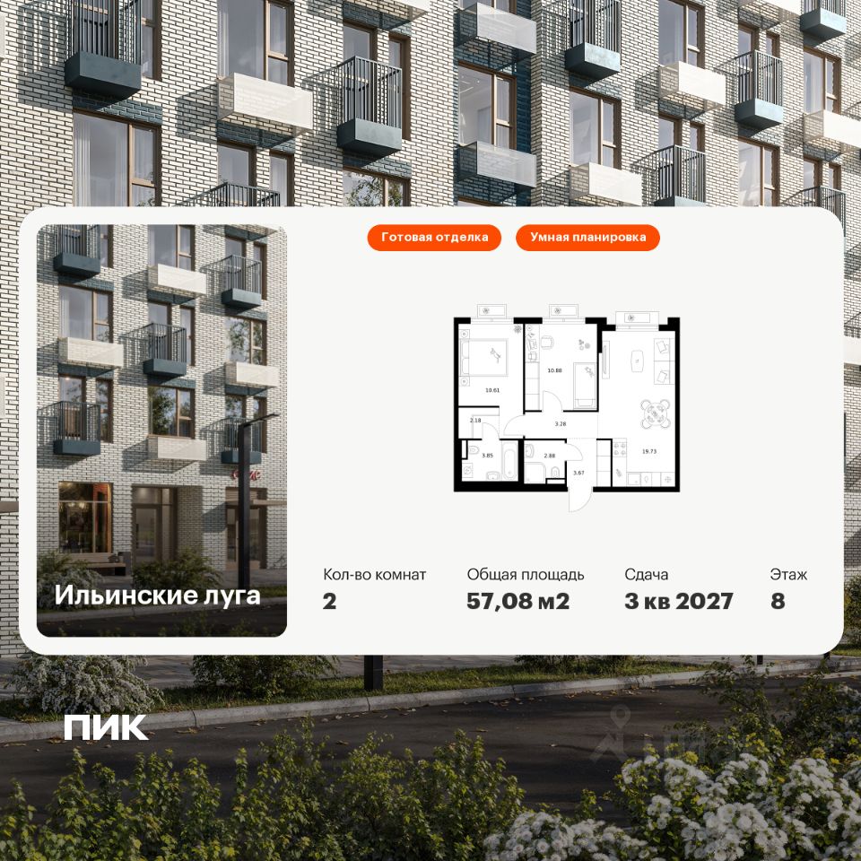 Продаётся 2-комн. квартира площадью 57,08 кв.м на 8 этаже 9 этажного дома (Корпус 4.1, Секция 1) проекта ПИК Ильинские луга. Светлый просторный подъезд на уровне земли, функциональная планировка, большие окна, c отделкой.