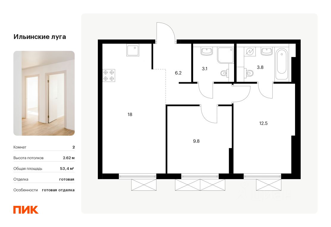 Продаётся 2-комн. квартира площадью 53,4 кв.м на 3 этаже 9 этажного дома (Корпус 2.8, Секция 3) проекта ПИК Ильинские луга. Светлый просторный подъезд на уровне земли, функциональная планировка, большие окна, c отделкой.