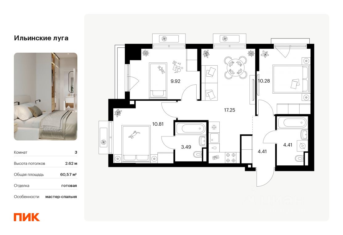 Продаётся 3-комн. квартира площадью 60,57 кв.м на 4 этаже 9 этажного дома (Корпус 4.1, Секция 5) проекта ПИК Ильинские луга. Светлый просторный подъезд на уровне земли, функциональная планировка, большие окна, c отделкой.
