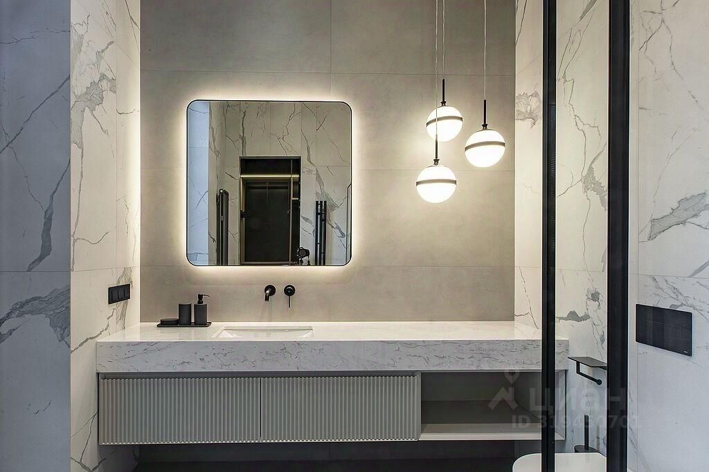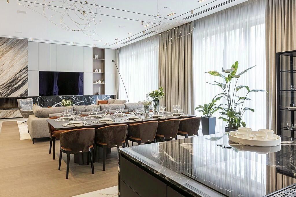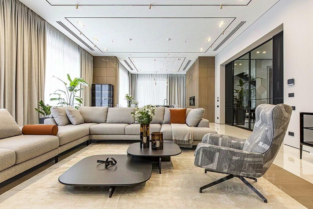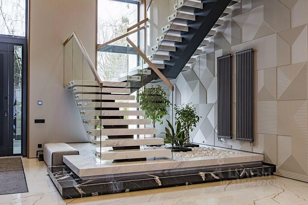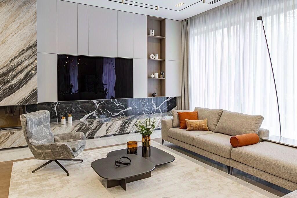 Отделка дома выполнена под ключ с мебелью, с использованием премиальных материалов и оборудования ведущих производителей. Напольное покрытие — инженерная доска Coswick, плитка — Porcelanosa, ITALON, Atlas Concorde, сантехника — Timo, Boheme, инсталляции — Geberit, светильники — Arlight, Gauss, FIUME, каминная топка — Piazetta, лестница выполнена из мрамора, межкомнатные двери высотой 2500-3000 мм.