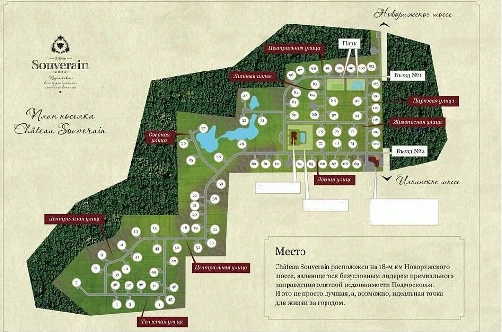 Chateau Souverain расположен в Красногорском районе Московской области, в 18 км от МКАД по Новорижскому или Ильинскому шоссе. В посёлке выполнено комплексное ландшафтное озеленение в едином стиле с посадкой елей и сосен, оборудованы 3 парковые зоны с каштановыми и липовыми аллеями.