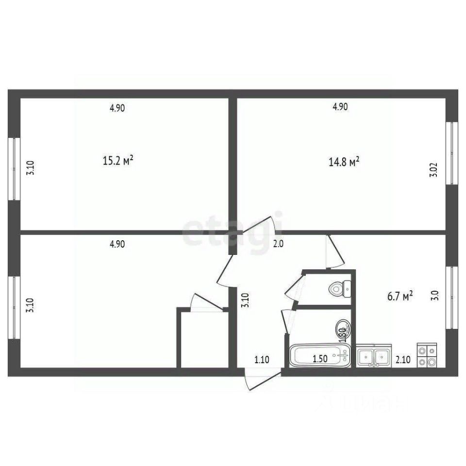 В квартире 2 полноценные раздельные спальни, площадью по 15.2 и 10 кв.м, просторная гостиная, площадью в 14.8 кв.м, а также кухня в 6.7 кв.м. Также в квартире присутствует совмещенный санузел. Окна смотрят на западную и восточную часть.
