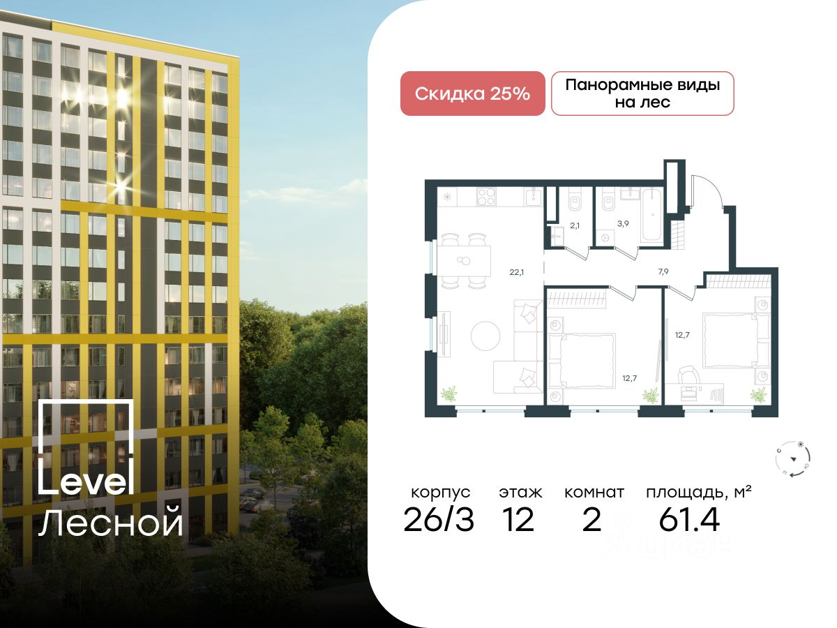 В районе, утопающем в густой зелени лесов, многочисленных парков и скверов, продаётся 2-комнатная квартира площадью 61.40 кв.м без отделки. Квартира расположена на 12 этаже в жилом комплексе комфорт-класса Level Лесной (компания Level Group/Левел групп).