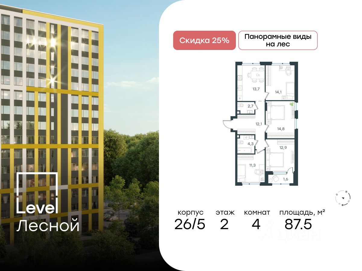В районе, утопающем в густой зелени лесов, многочисленных парков и скверов, продаётся 4-комнатная квартира площадью 87.50 кв.м с отделкой white box. Квартира расположена на 2 этаже в жилом комплексе комфорт-класса Level Лесной (компания Level Group/Левел групп).