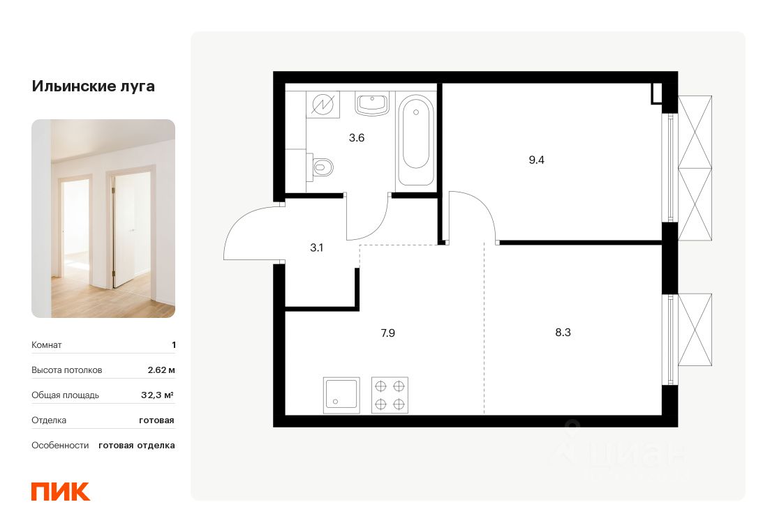 Продаётся 1-комн. квартира площадью 32,3 кв.м на 6 этаже 9 этажного дома (Корпус 2.9, Секция 3) проекта ПИК Ильинские луга. Светлый просторный подъезд на уровне земли, функциональная планировка, большие окна, c отделкой.