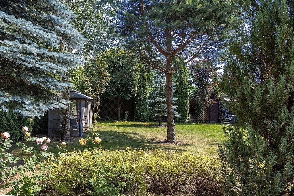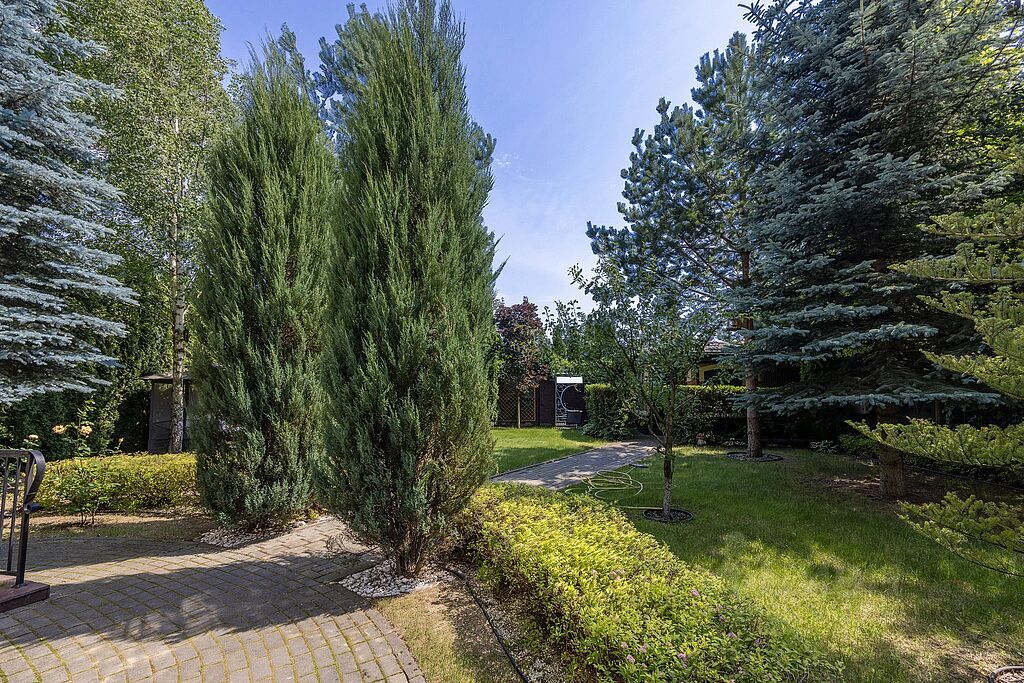 Расположен в закрытой зоне, вдали от шума, с продуманным ландшафтом: по периметру — туи и голубые ели, создающие ощущение приватности и уюта.