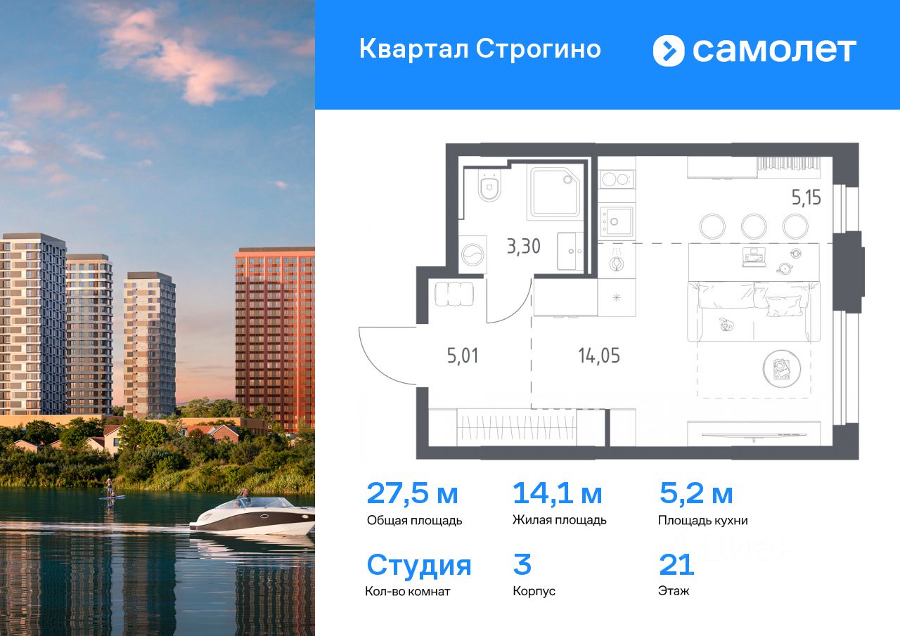 Предлагается квартира студия комфорт-класса 27,51 кв.м в корпусе 3 на 21 этаже, в ЖК ''Квартал Строгино'' Квартира без отделки. Доступность опции ''отделка'' и возможность комплектации мебелью и декором уточняйте у застройщика.