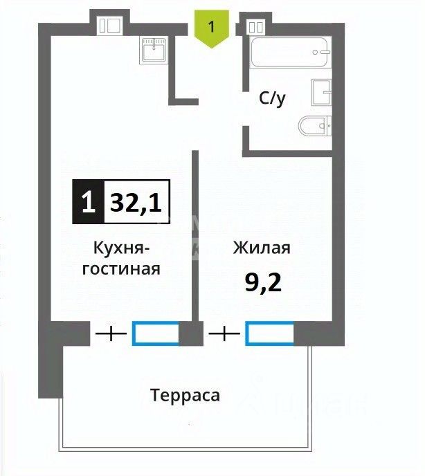 Общая площадь квартиры составляет 32,1 кв. м, жилая площадь - 9.2 кв. м, площадь кухни - 5 кв. м. Главным плюсом можно выделить - присутствие собственной веранды площадью 13 кв.м (со светом, розетками, крышей и отдельный вход со двора), которая станет идеальным местом для отдыха на свежем воздухе.