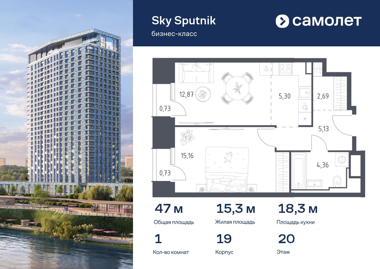 Предлагаются 1-комнатные апартаменты бизнес-класса 46,97 кв.м в корпусе 19 на 20 этаже, в Sky Sputnik Апартаменты без отделки. Доступность опции ''отделка'' и возможность комплектации мебелью и декором уточняйте у застройщика.