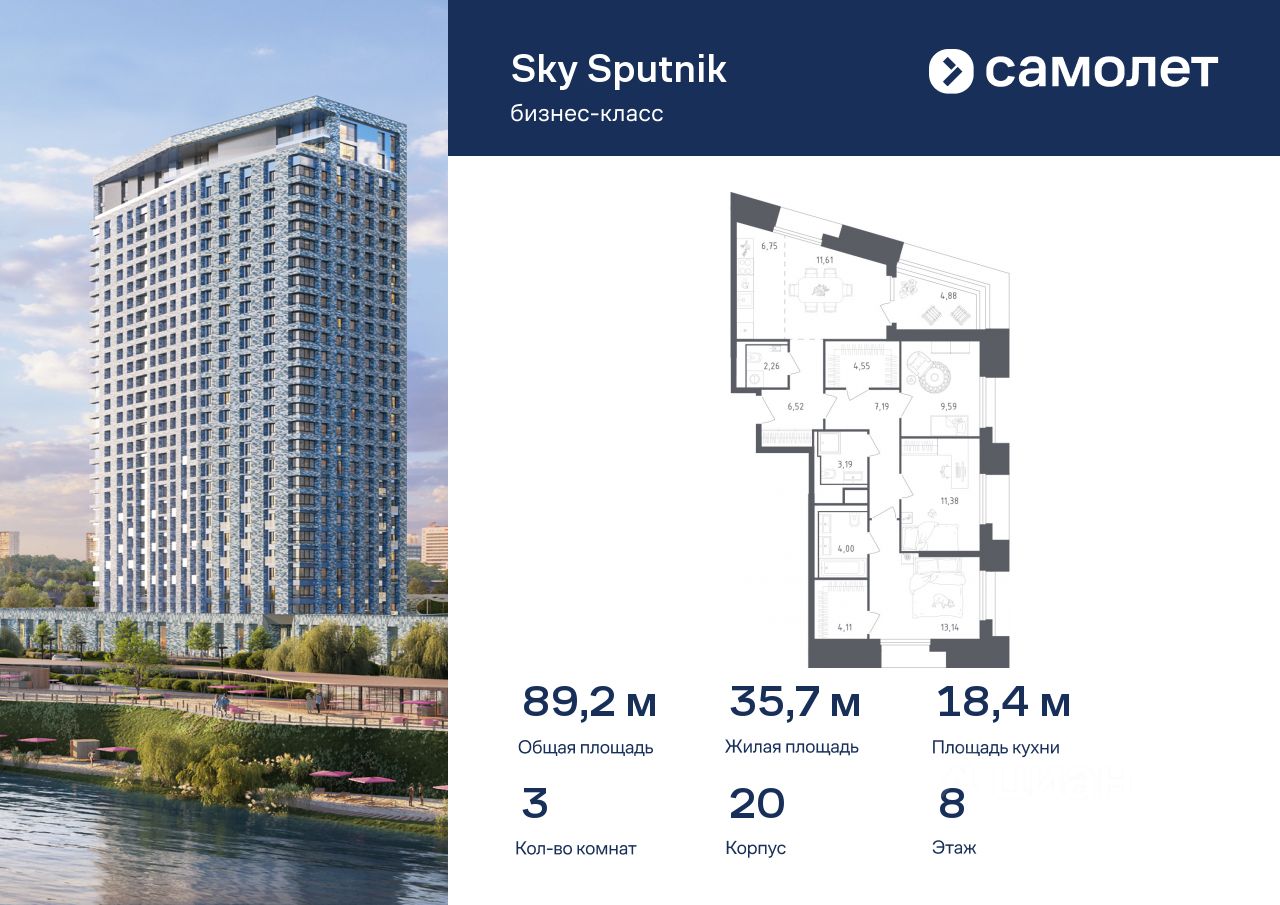Предлагаются 3-комнатные апартаменты бизнес-класса 89,17 кв.м в корпусе 20 на 8 этаже, в Sky Sputnik Апартаменты с предчистовой отделкой. Доступность дополнительных опций уточняйте у застройщика.