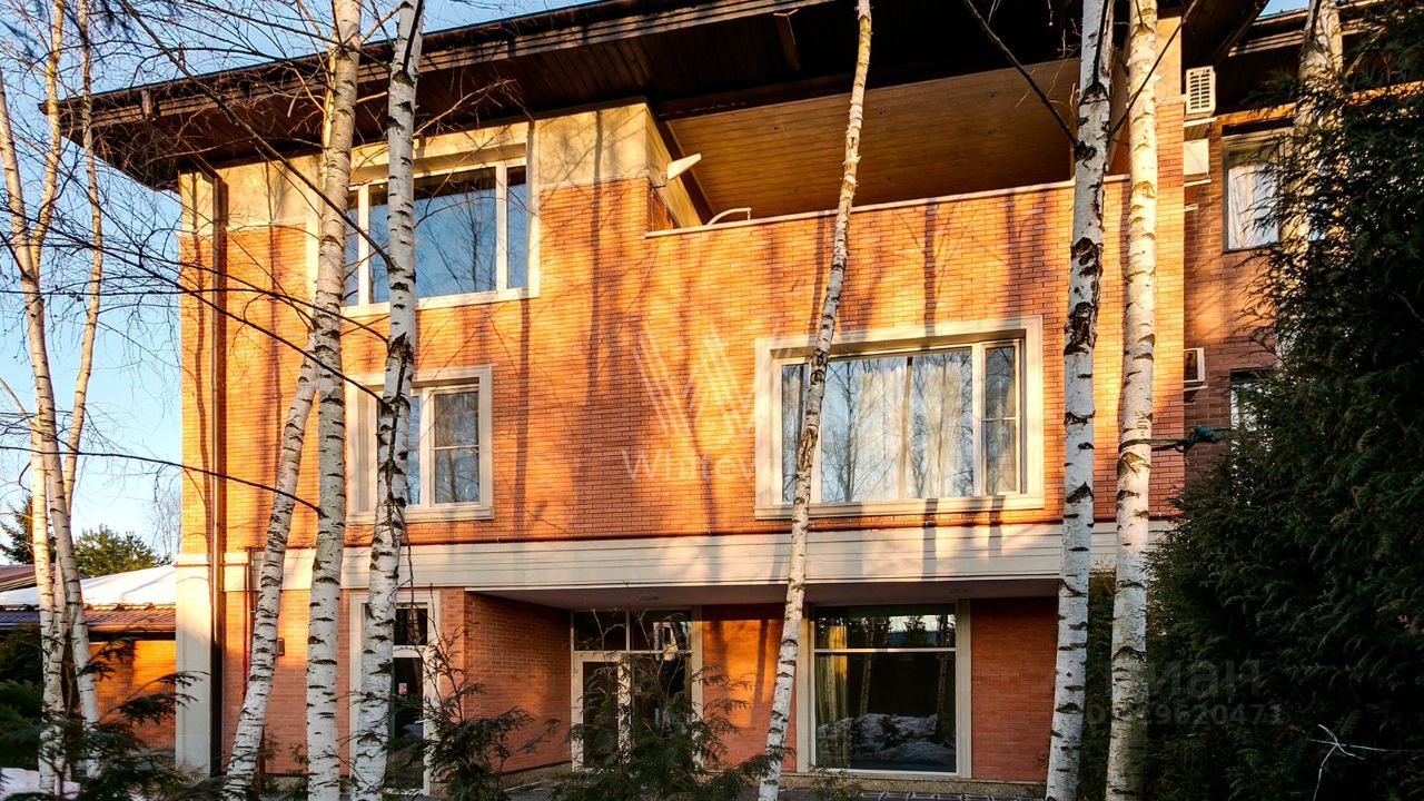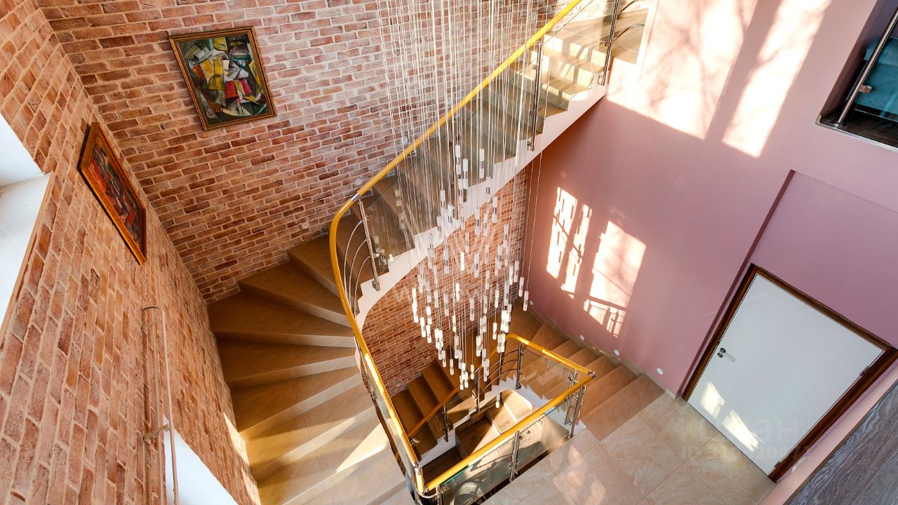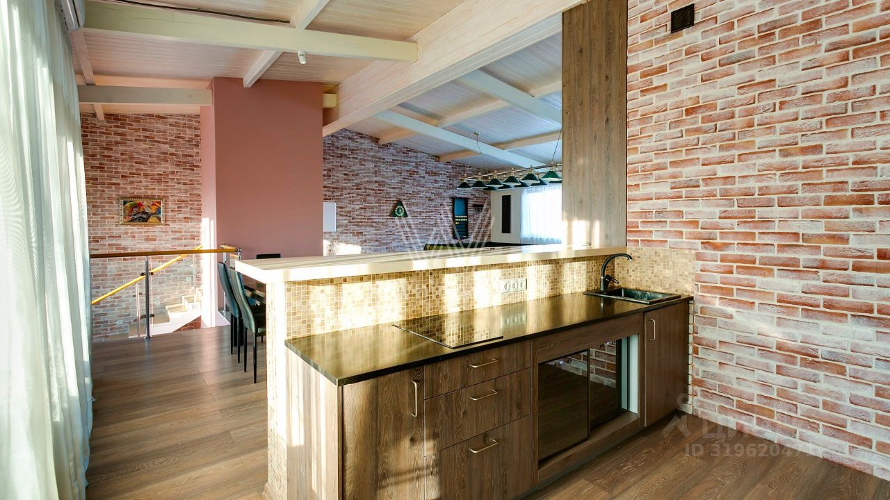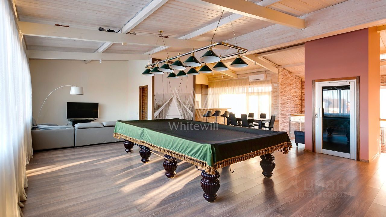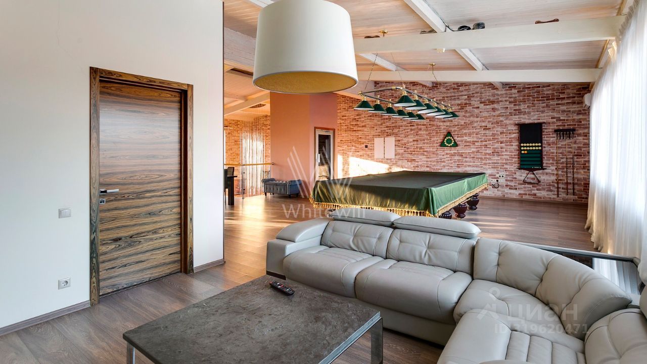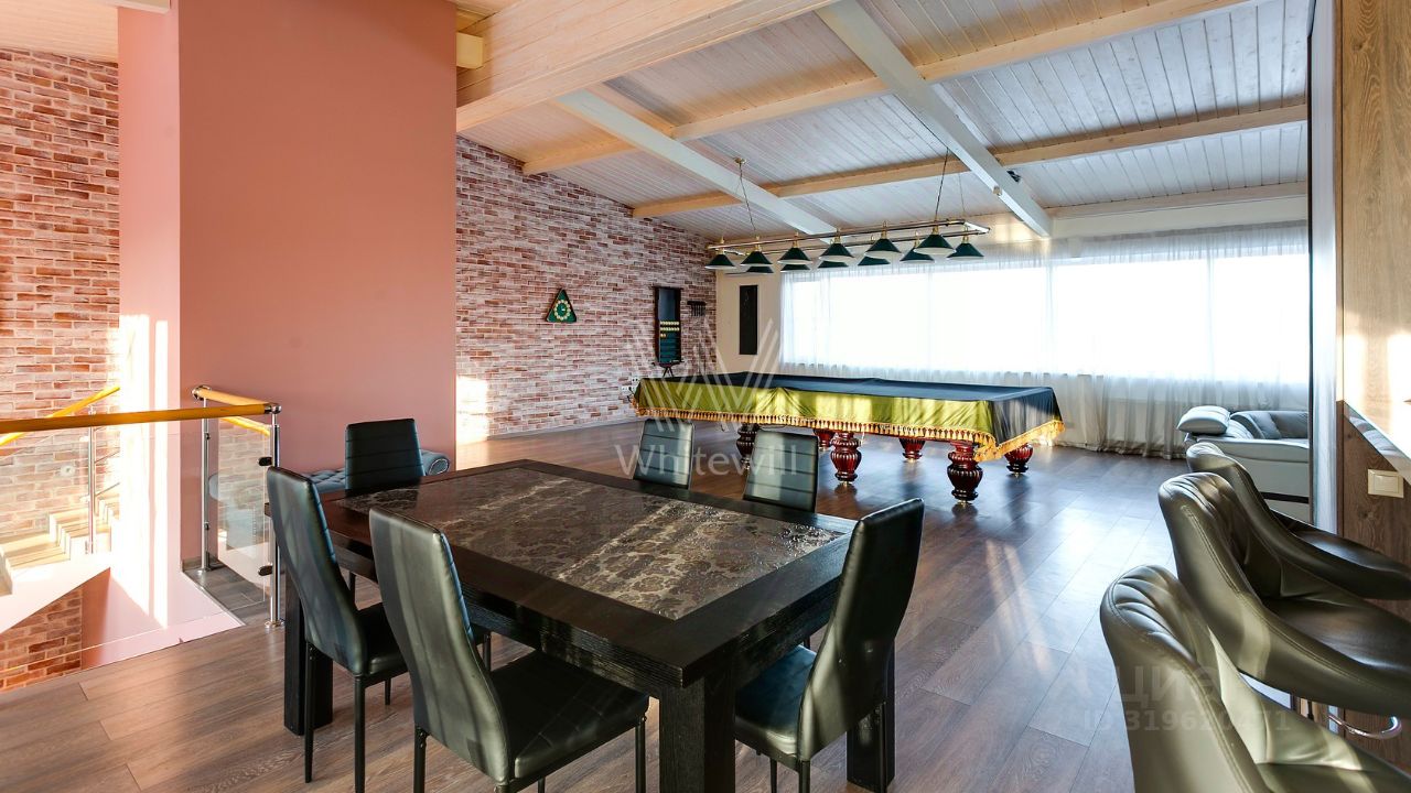 ID 10 107. Ольгино. Загородный дом площадью 400 м² расположен на участке 10 соток. Фасад выполнен из красного клинкерного кирпича, окна украшены белыми наличниками. Современный интерьер выполнен в теплой палитре оттенков, создающих атмосферу уюта. В таунхаусе спланировали 5 спален, гостиную-столовую-кухню, бильярдную с зоной отдыха. На территории предусмотрены гараж на 2 машины, паркинг на 6 машин, баня с 2 гостевыми спальнями и зона барбекю. На участке выполнен ландшафтный дизайн, вымощены дорожки.