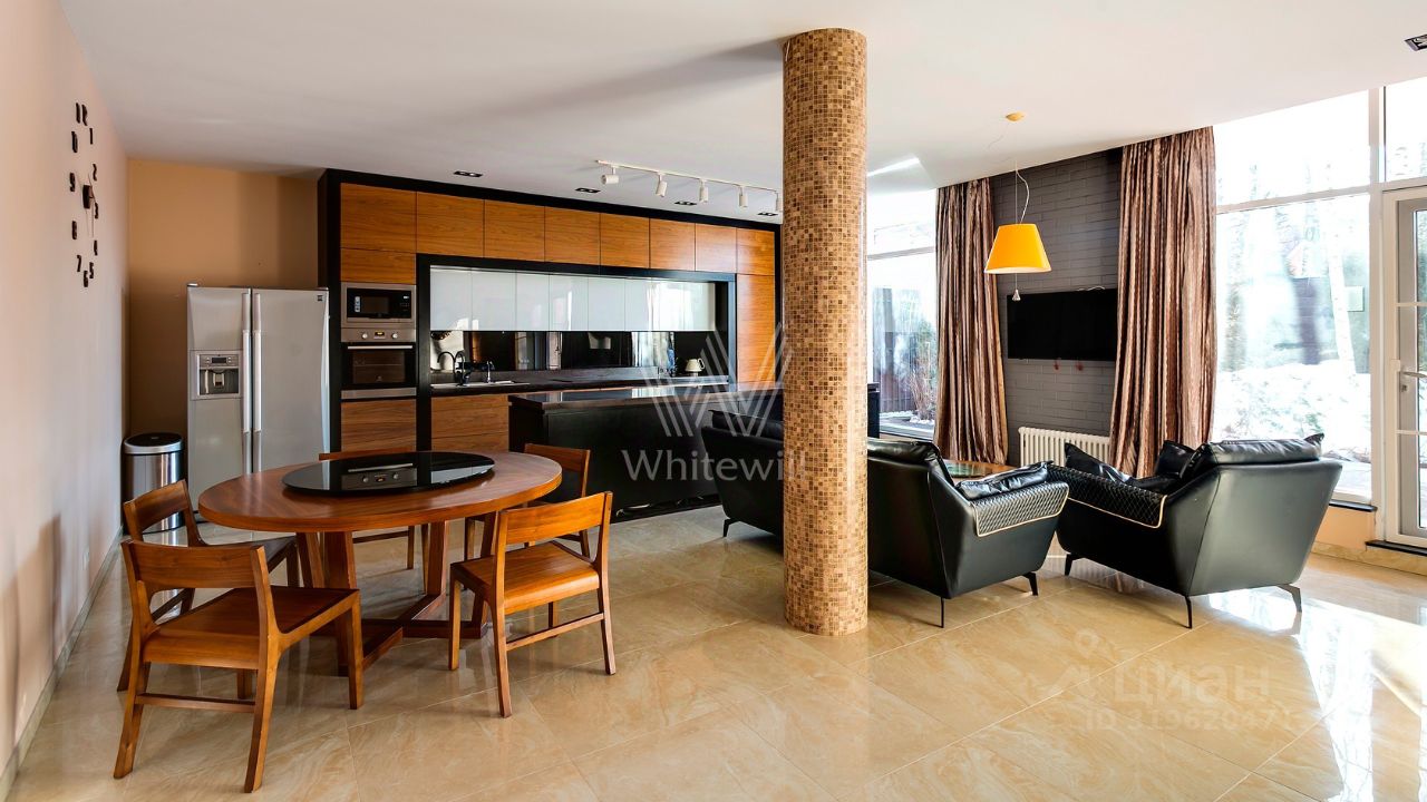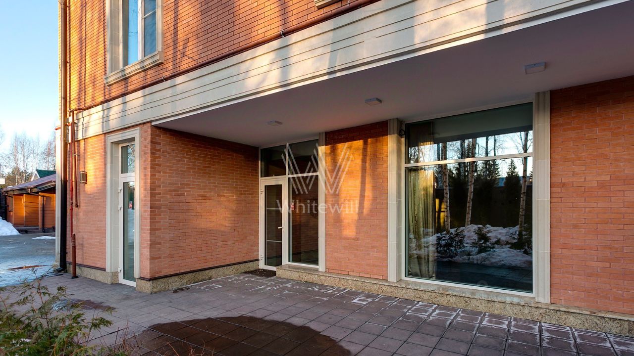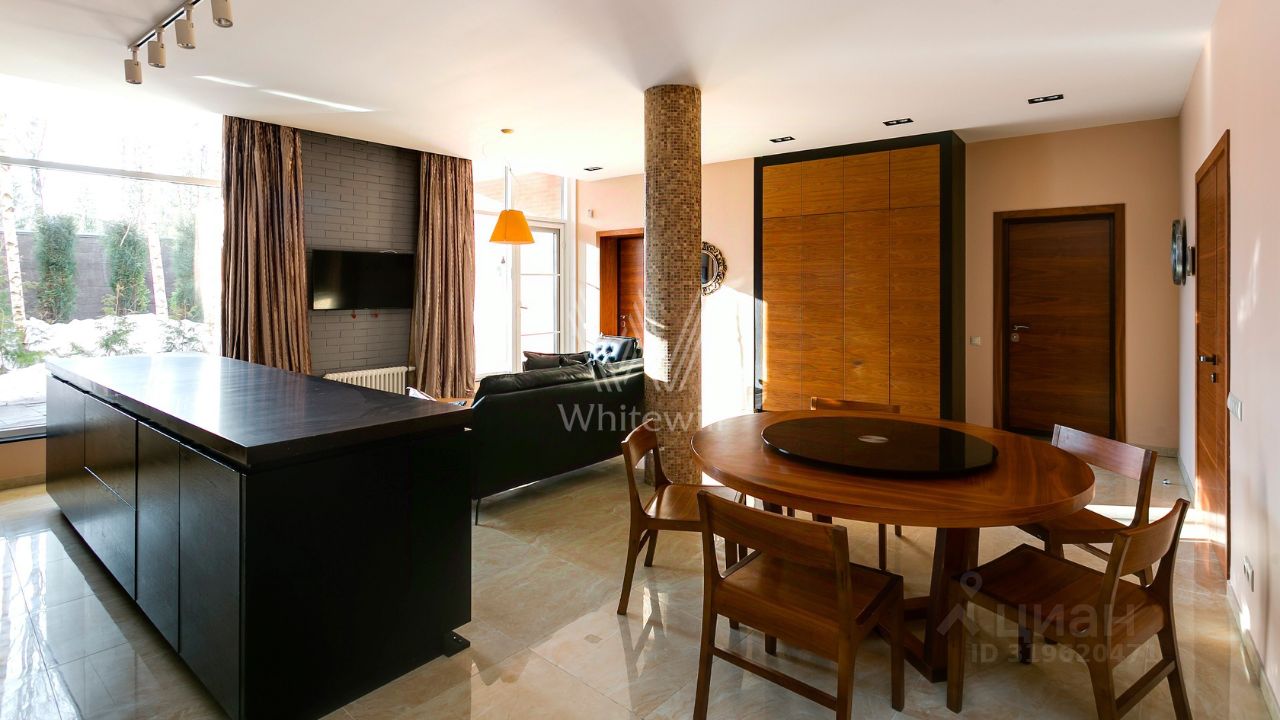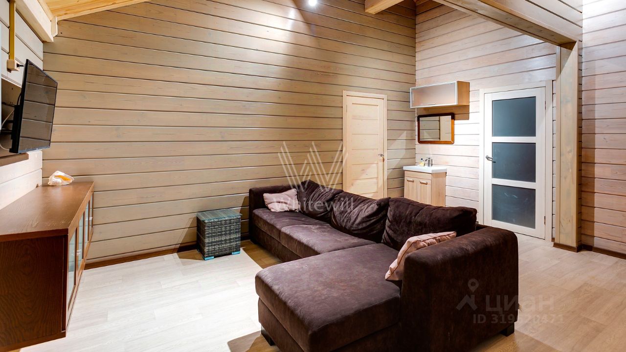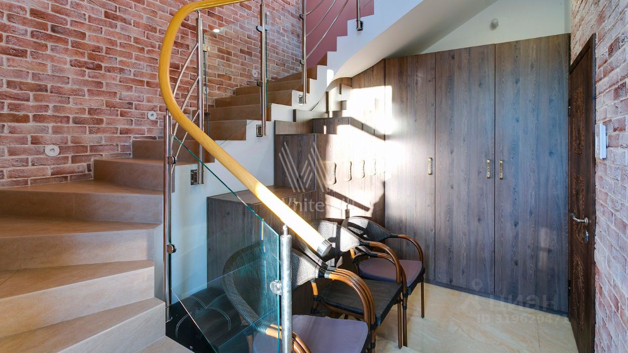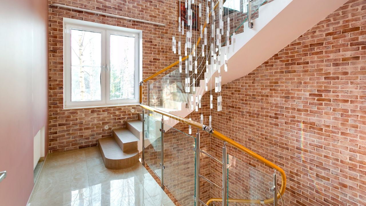 ID 10 107. Ольгино. Загородный дом площадью 400 м² расположен на участке 10 соток. Фасад выполнен из красного клинкерного кирпича, окна украшены белыми наличниками. Современный интерьер выполнен в теплой палитре оттенков, создающих атмосферу уюта. В таунхаусе спланировали 5 спален, гостиную-столовую-кухню, бильярдную с зоной отдыха. На территории предусмотрены гараж на 2 машины, паркинг на 6 машин, баня с 2 гостевыми спальнями и зона барбекю. На участке выполнен ландшафтный дизайн, вымощены дорожки.