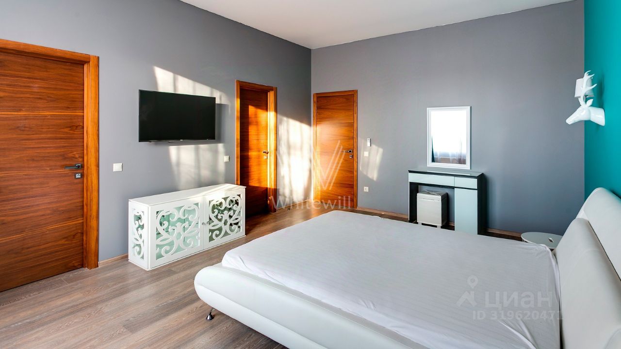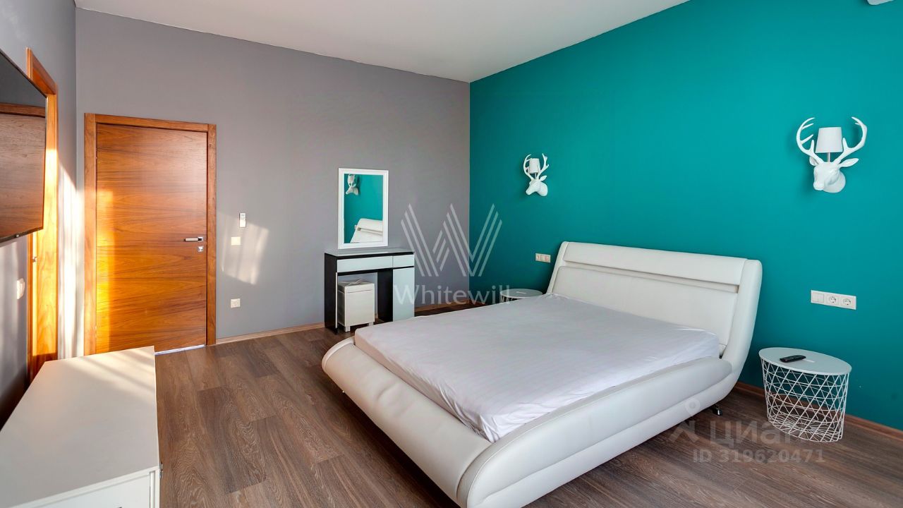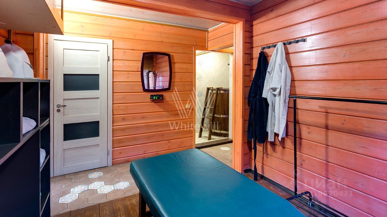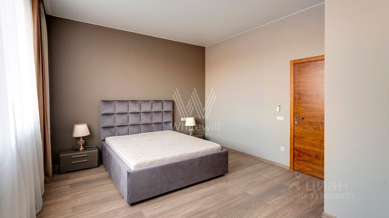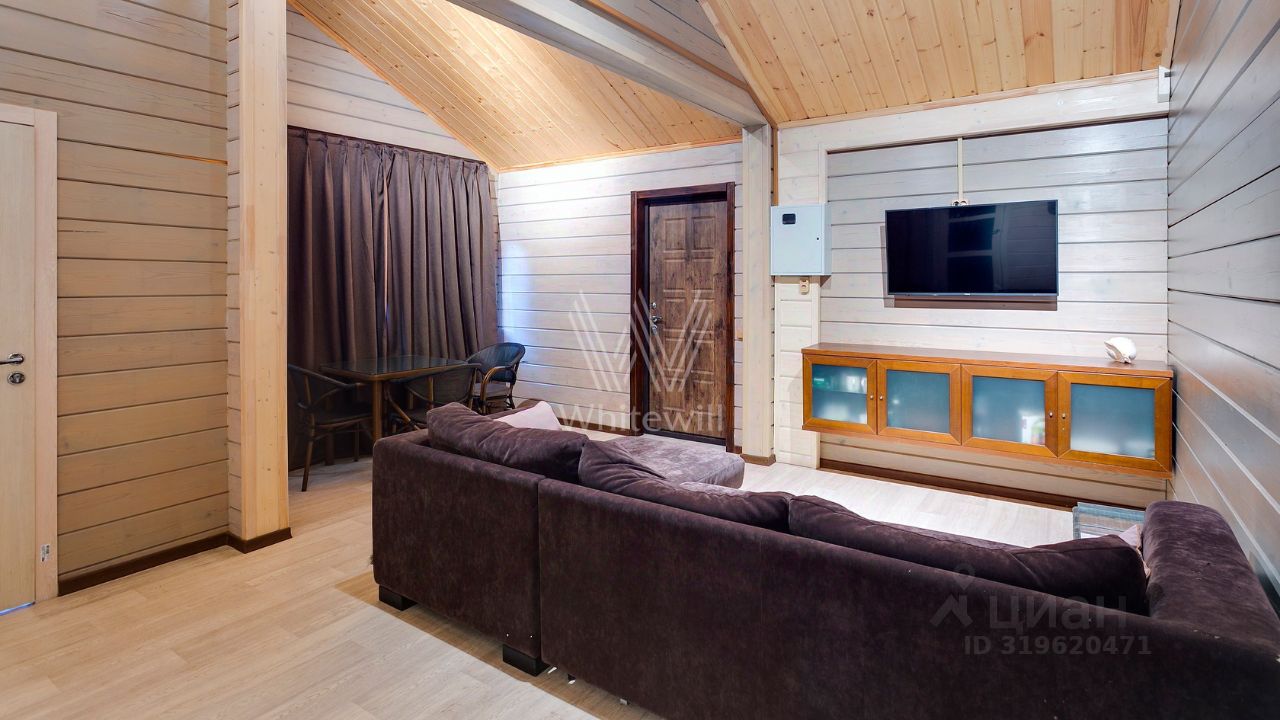 ID 10 107. Ольгино. Загородный дом площадью 400 м² расположен на участке 10 соток. Фасад выполнен из красного клинкерного кирпича, окна украшены белыми наличниками. Современный интерьер выполнен в теплой палитре оттенков, создающих атмосферу уюта. В таунхаусе спланировали 5 спален, гостиную-столовую-кухню, бильярдную с зоной отдыха. На территории предусмотрены гараж на 2 машины, паркинг на 6 машин, баня с 2 гостевыми спальнями и зона барбекю. На участке выполнен ландшафтный дизайн, вымощены дорожки.