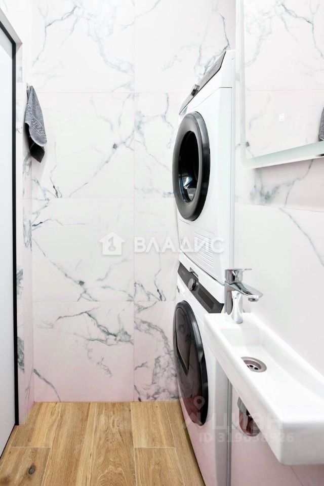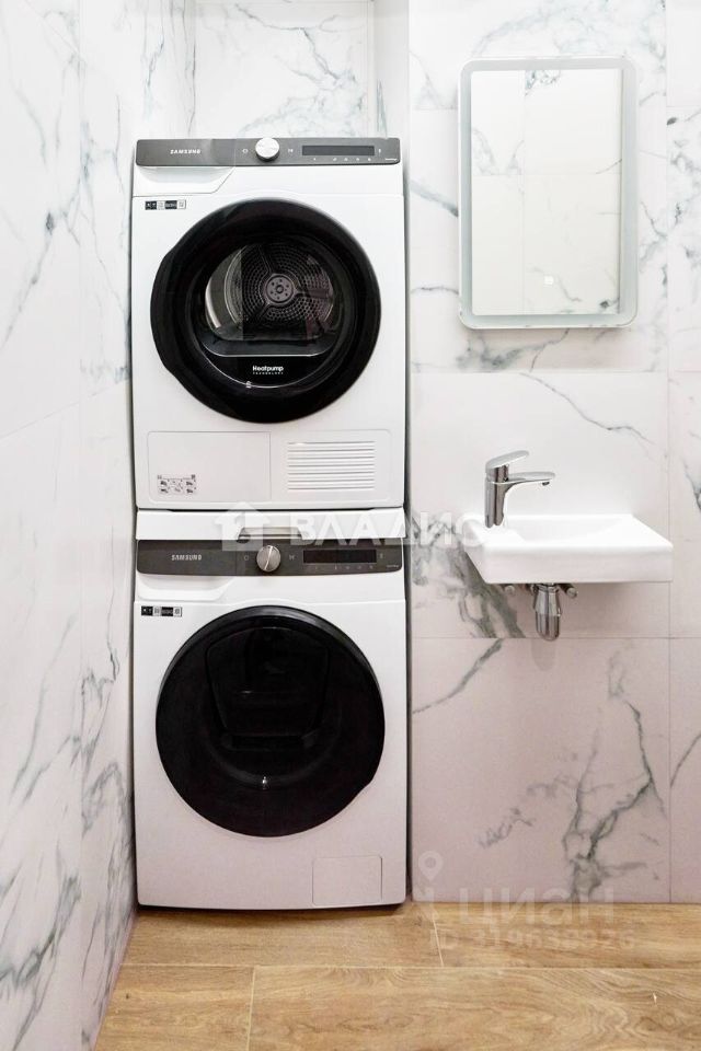 Санузел и ванная: - Просторная ванна с нишами из плитки и нишей-шкафом - Санузел-постирочная с гигиеническим душем - Новая стиральная и сушильная машины Samsung с интеллектуальными панелями