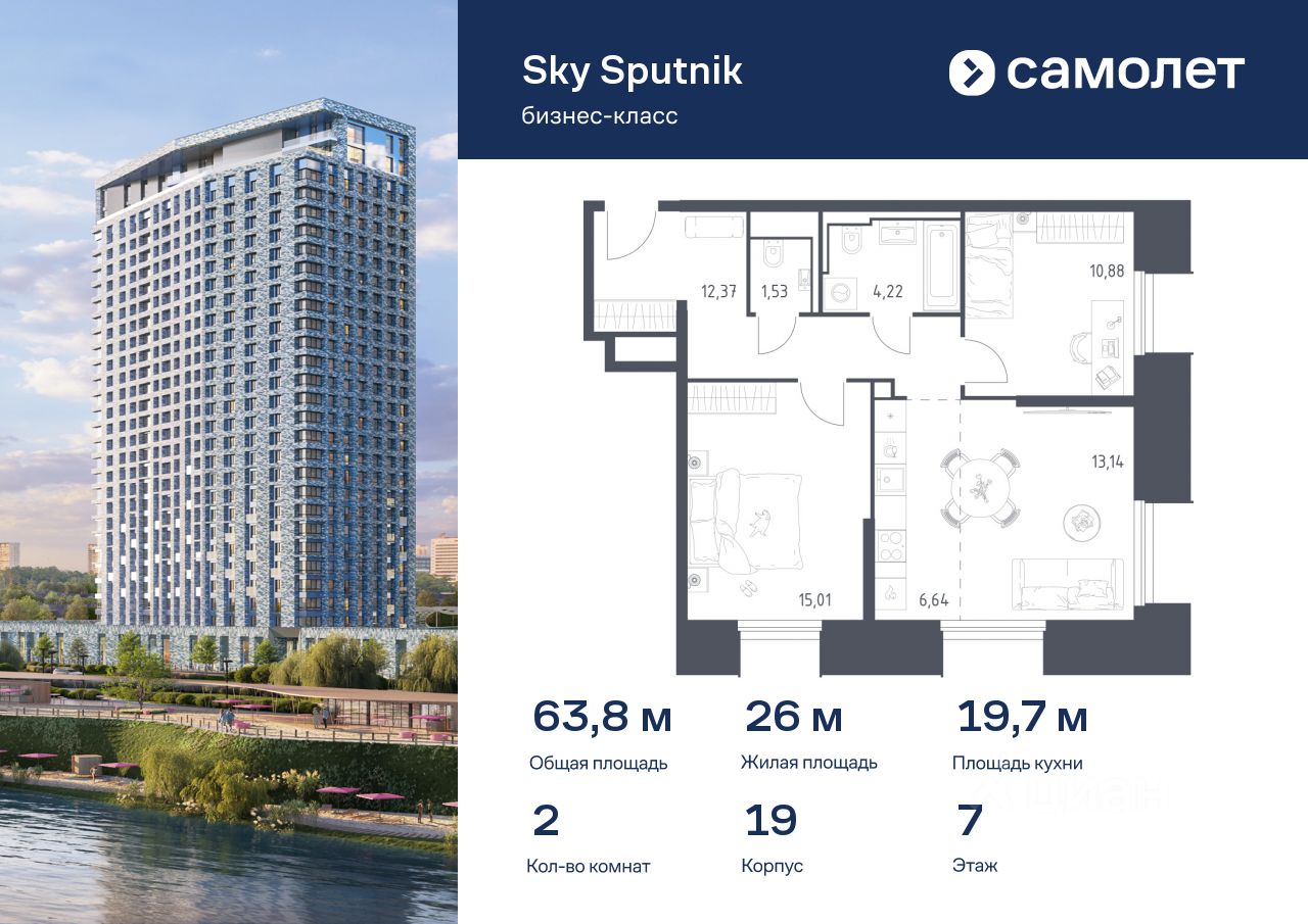Предлагаются 2-комнатные апартаменты бизнес-класса 63,79 кв.м в корпусе 19 на 7 этаже, в Sky Sputnik Апартаменты без отделки. Доступность опции ''отделка'' и возможность комплектации мебелью и декором уточняйте у застройщика.