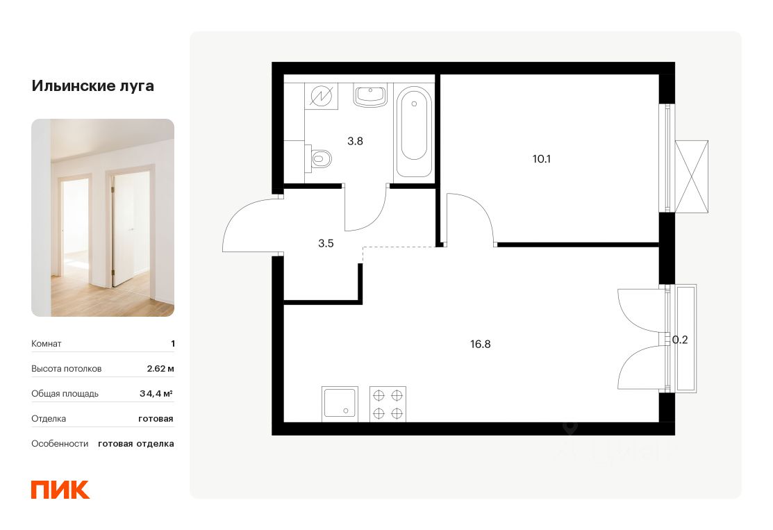 Продаётся 1-комн. квартира площадью 34,4 кв.м на 4 этаже 9 этажного дома (Корпус 2.8, Секция 4) проекта ПИК Ильинские луга. Светлый просторный подъезд на уровне земли, функциональная планировка, большие окна, c отделкой.