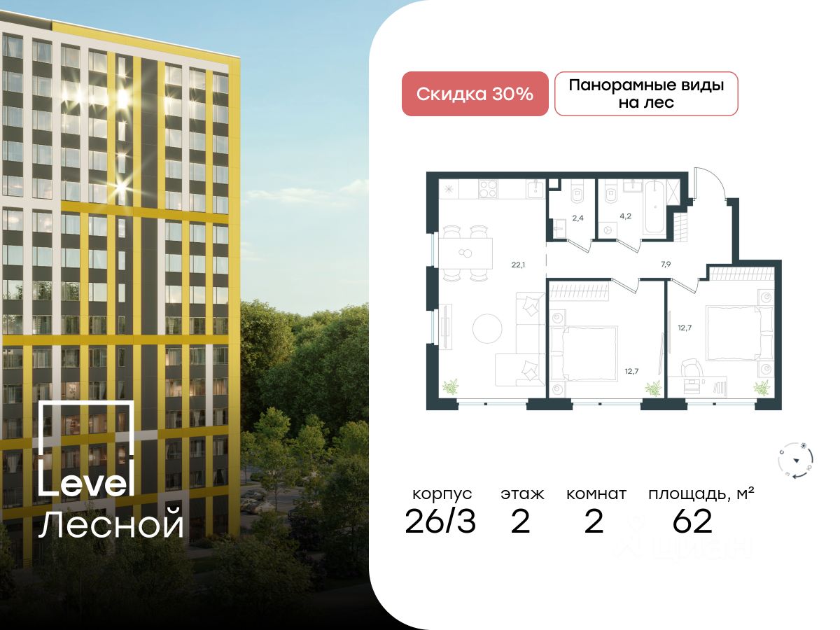 В районе, утопающем в густой зелени лесов, многочисленных парков и скверов, продаётся 2-комнатная квартира площадью 62.00 кв.м без отделки. Квартира расположена на 2 этаже в жилом комплексе комфорт-класса Level Лесной (компания Level Group/Левел групп).