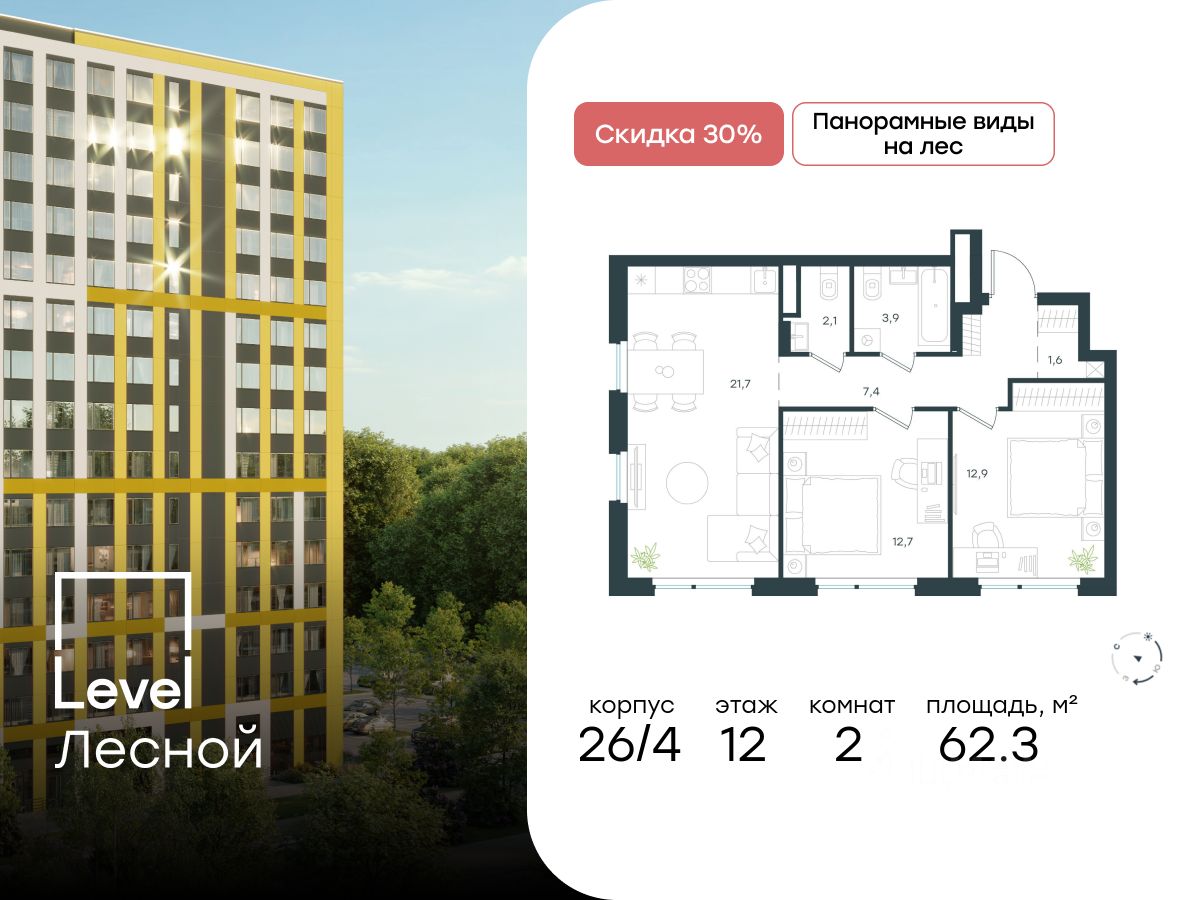 В районе, утопающем в густой зелени лесов, многочисленных парков и скверов, продаётся 2-комнатная квартира площадью 62.30 кв.м с отделкой white box. Квартира расположена на 12 этаже в жилом комплексе комфорт-класса Level Лесной (компания Level Group/Левел групп).