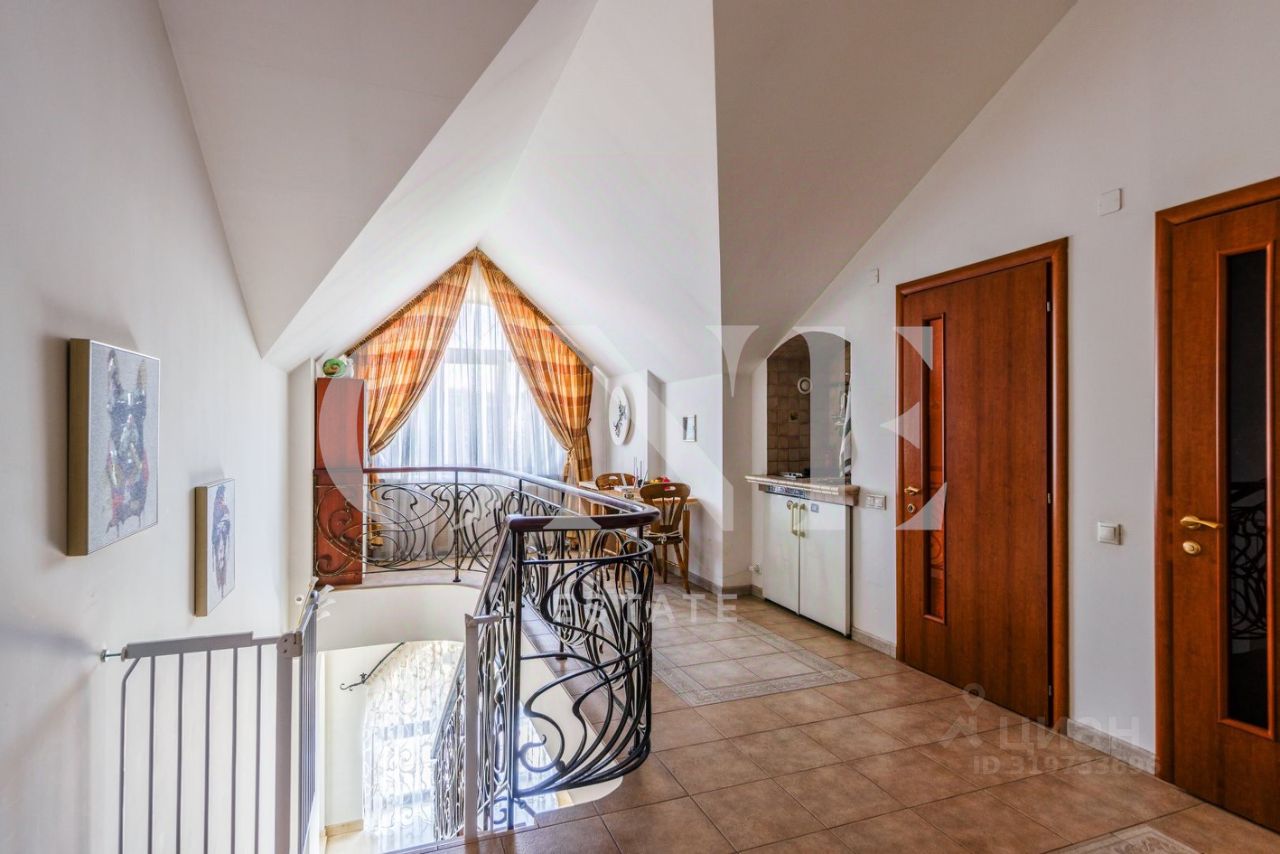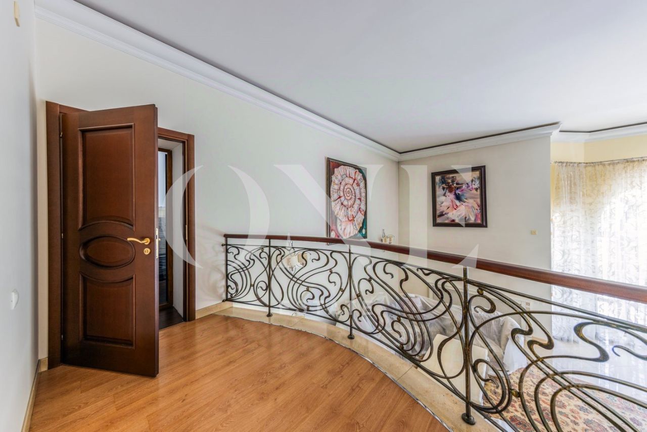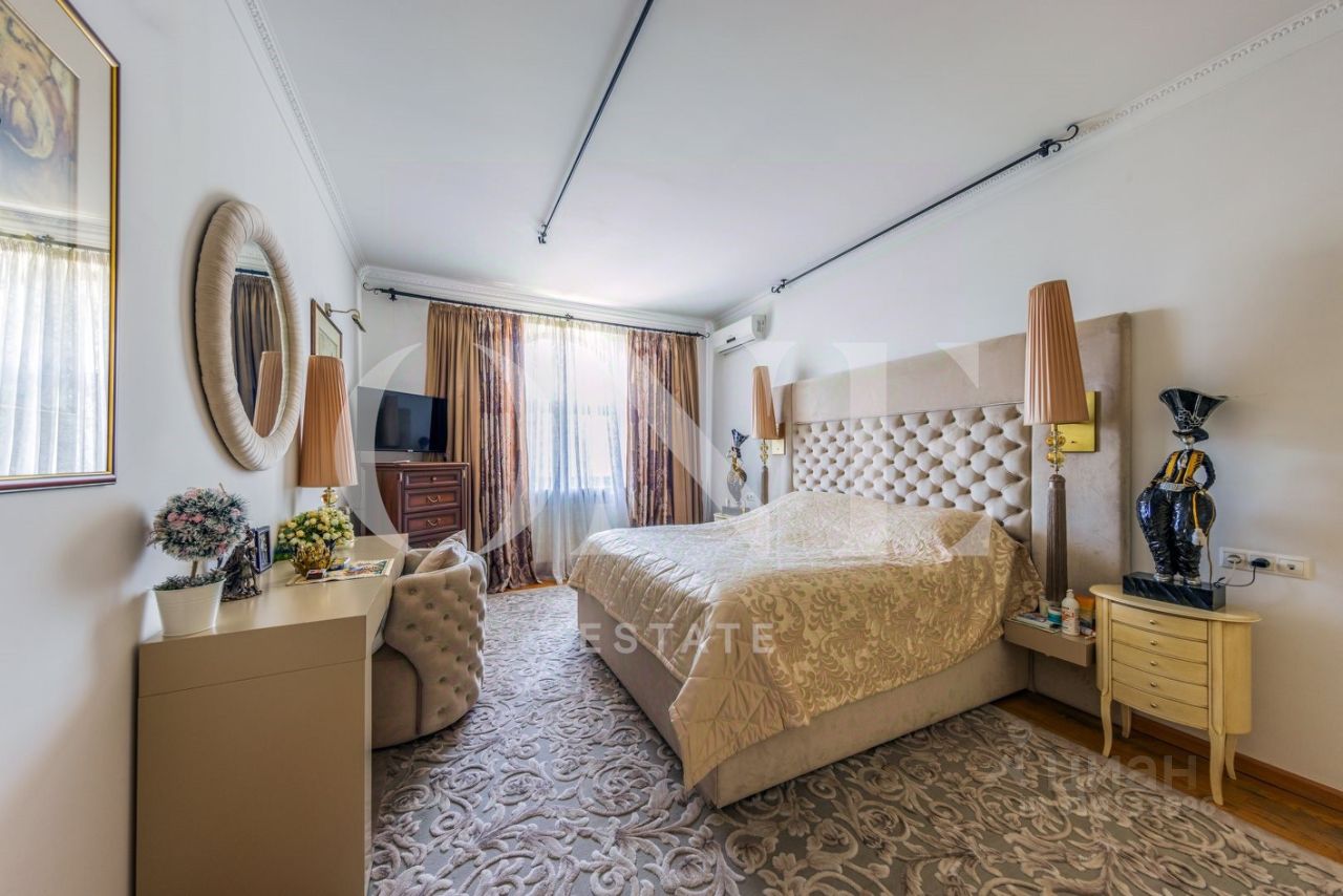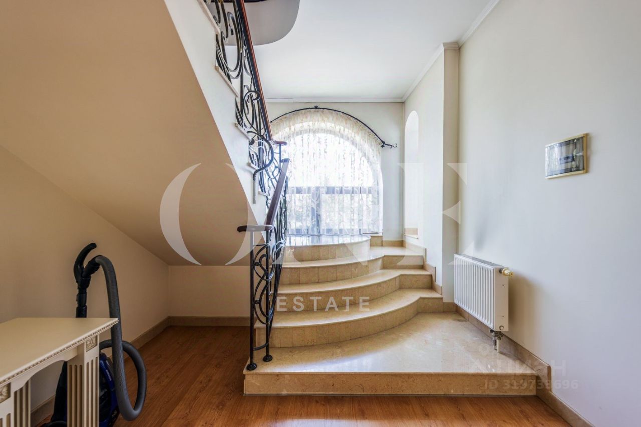 Дом построен из кирпича. Классический интерьер перекликается с удобной планировкой, выполненной по эксклюзивному заказу под большую семью. В доме есть помещение для персонала с отдельным входом. Предусмотрен встроенный гараж 90 кв.м для 3-х автомобилей. Всего на придомовой территории возможно разместить до 10 автомобилей.