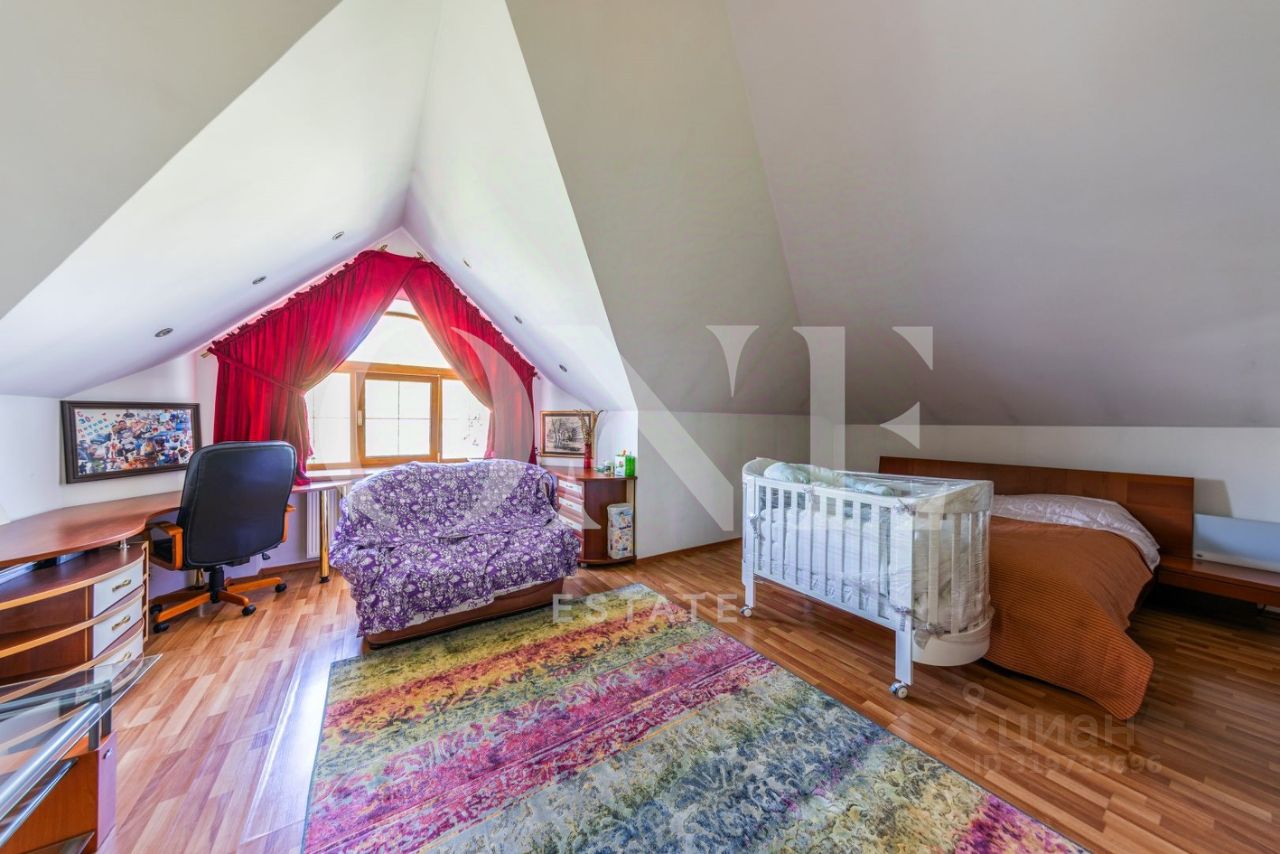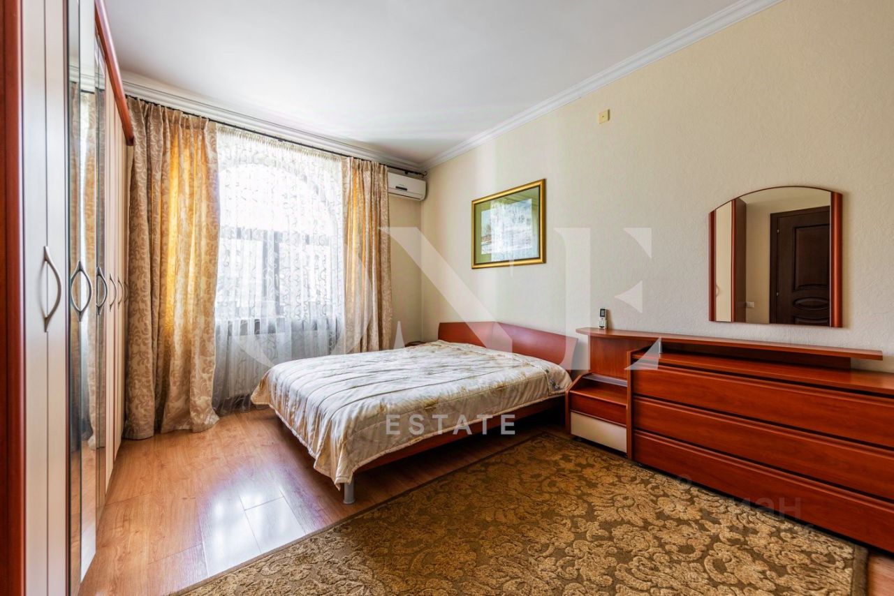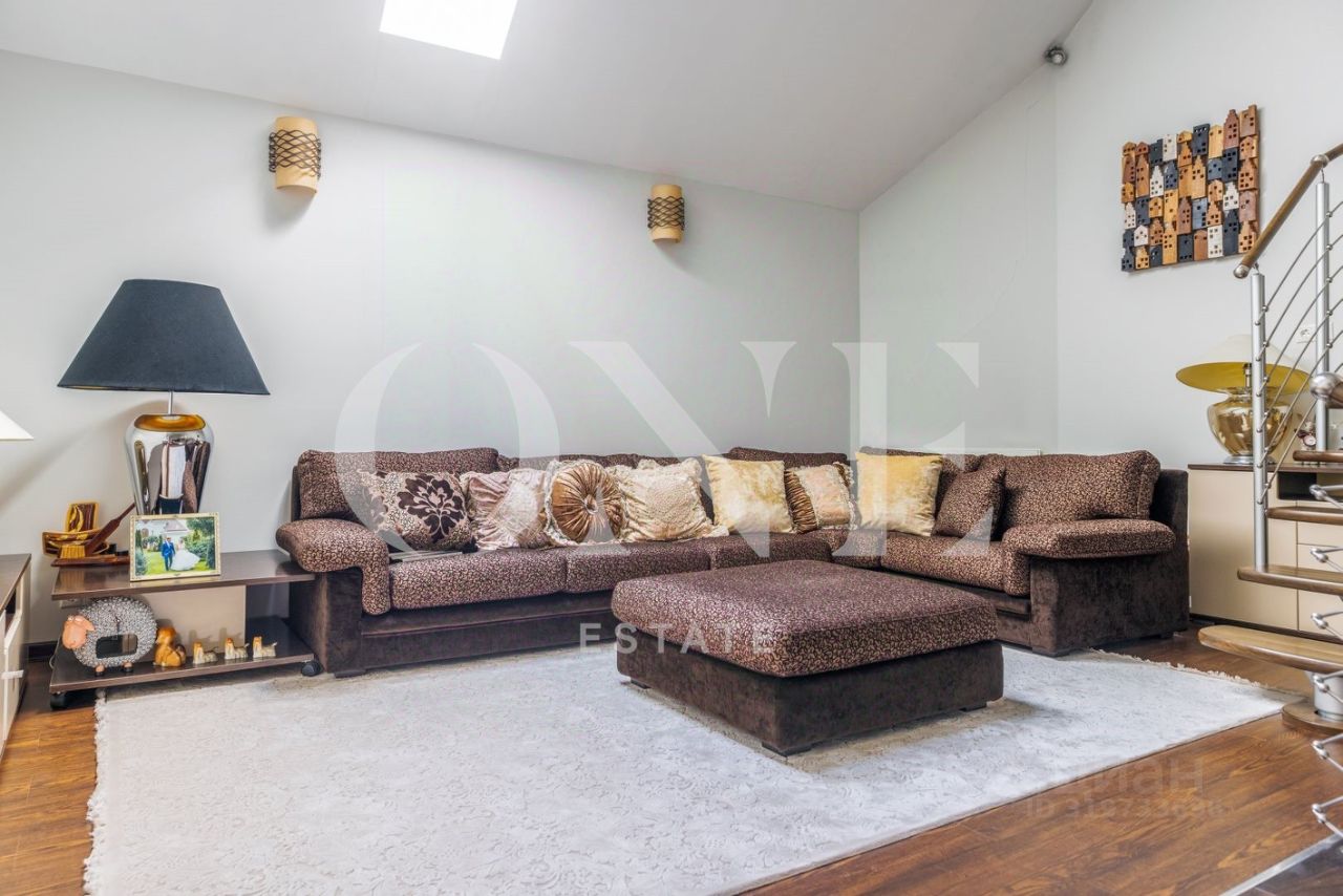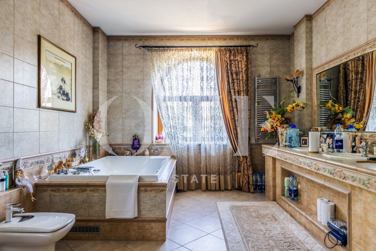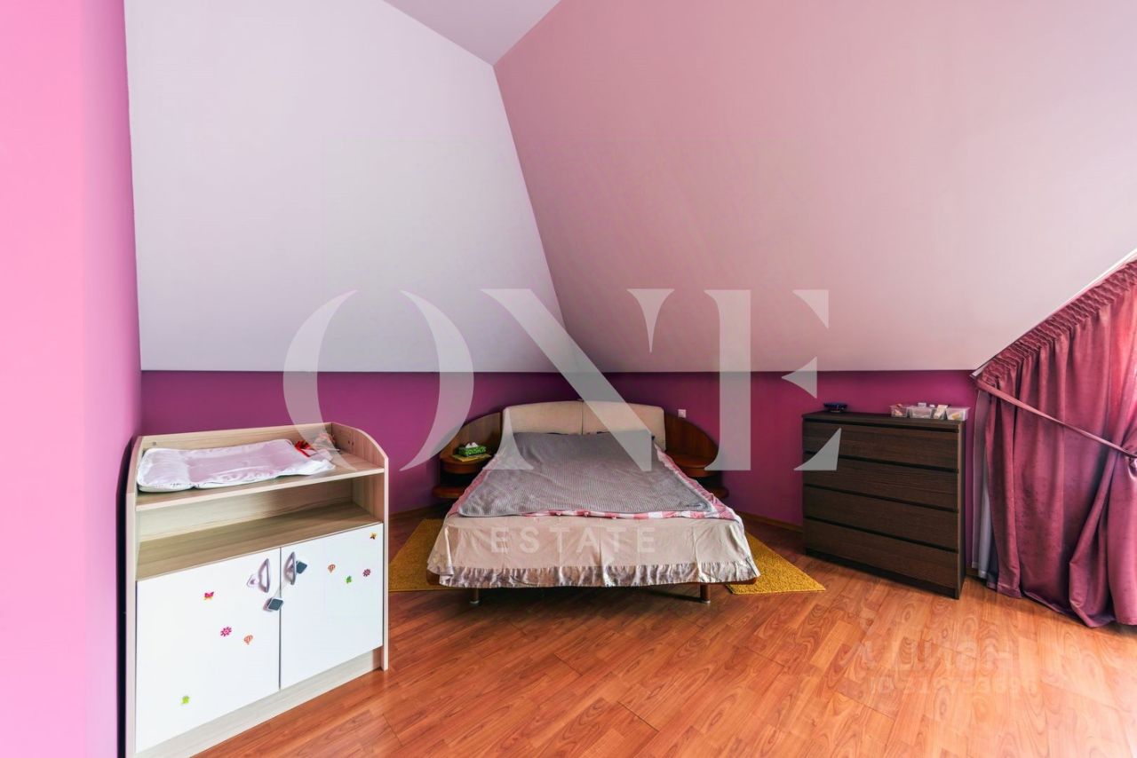 Дом построен из кирпича. Классический интерьер перекликается с удобной планировкой, выполненной по эксклюзивному заказу под большую семью. В доме есть помещение для персонала с отдельным входом. Предусмотрен встроенный гараж 90 кв.м для 3-х автомобилей. Всего на придомовой территории возможно разместить до 10 автомобилей.