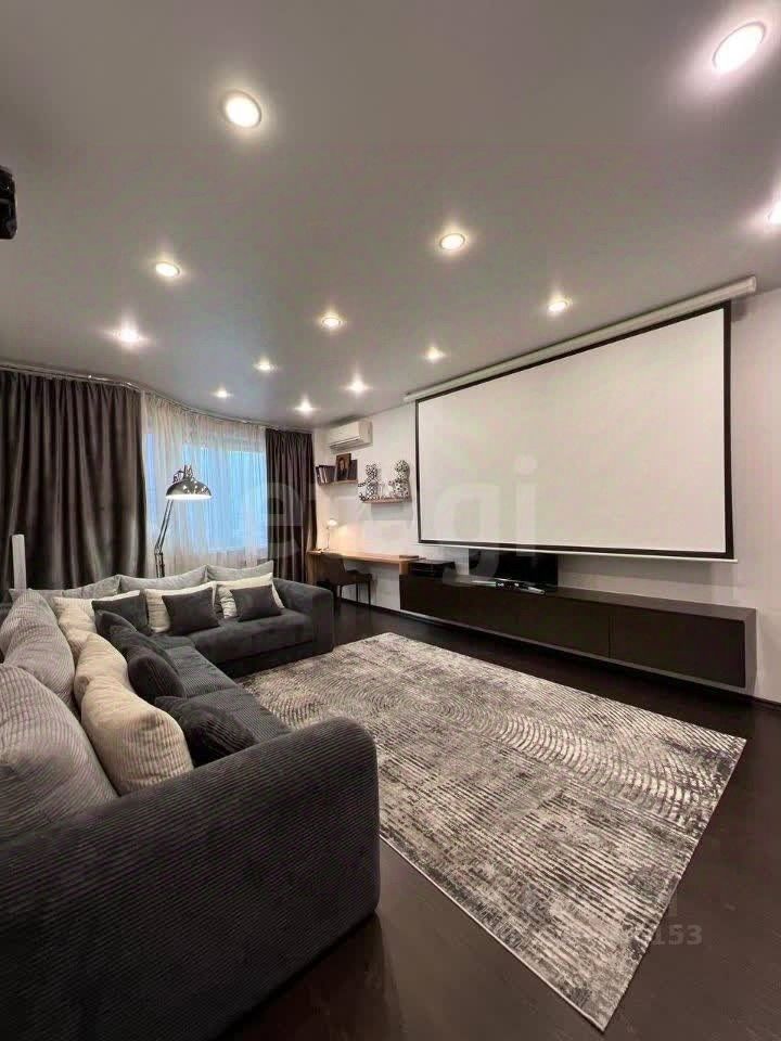 Квартира полностью готова к комфортному проживанию: установлены три кондиционера, система теплого пола на кухне и в санузлах, а в гостиной предусмотрено место для проектора, что создает удобную зону для отдыха и домашнего кинотеатра.