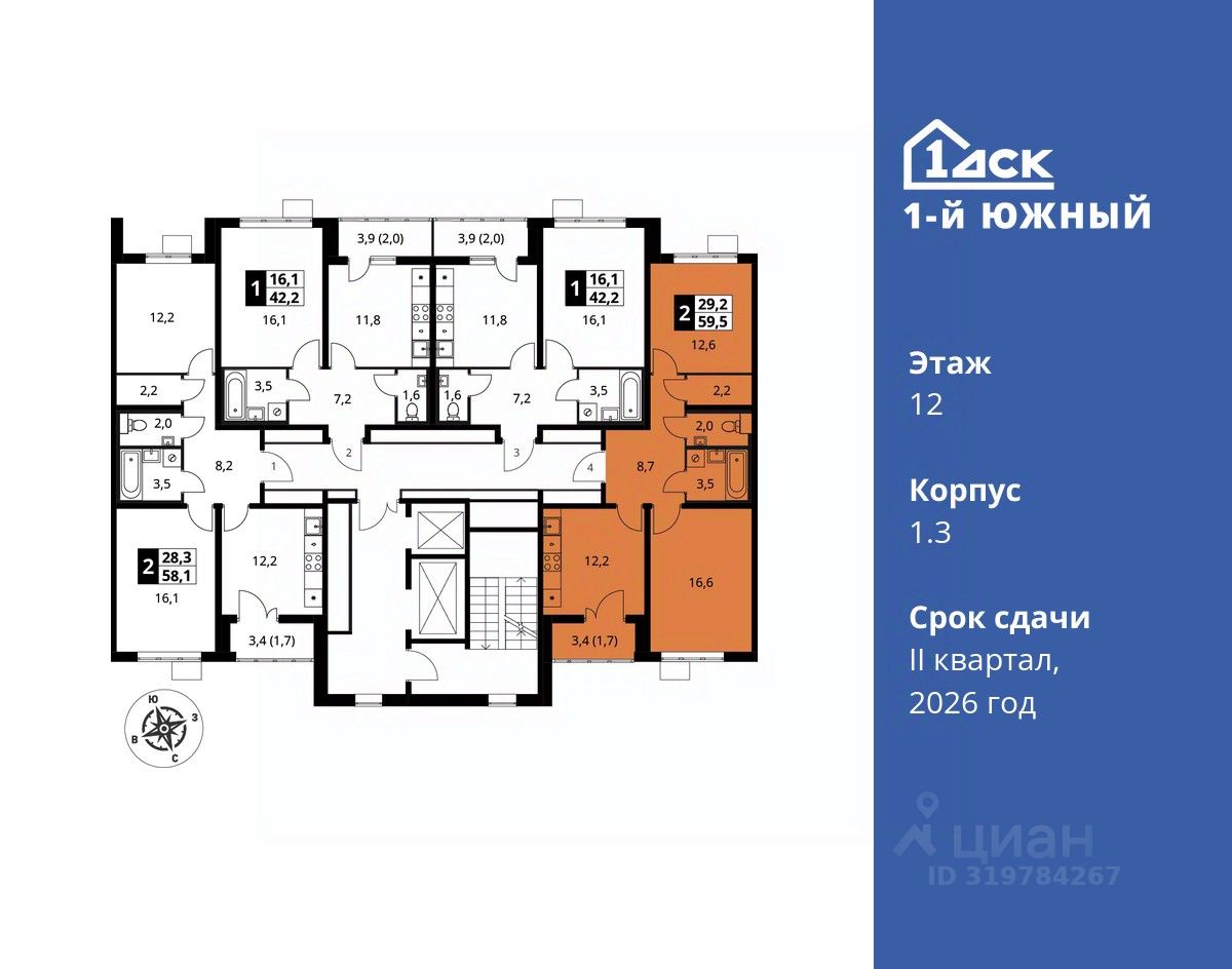 продам 2-к, Первый Южный ЖК, 1.312 300 078 ₽