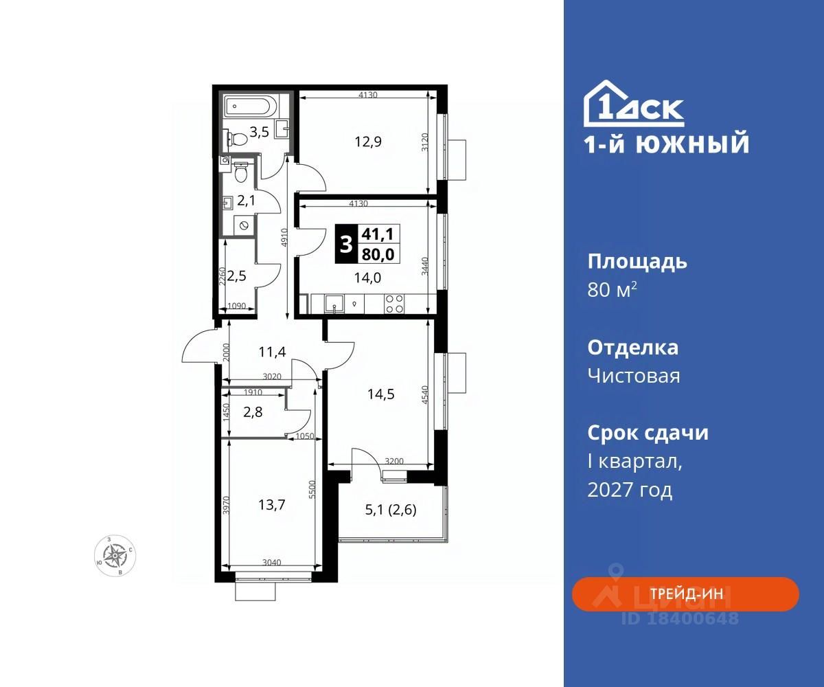 Максимальные скидки при 100% оплате. Trade-in вместо первоначального взноса - выгодно обменяйте вашу квартиру на новую! Прямая продажа от застройщика! Жилой Комплекс класса Комфорт плюс. Продаётся 3-к квартира номер 173 общей площадью 80 кв.м на 12-м этаже 24 этажного дома. Чистовая отделка.
