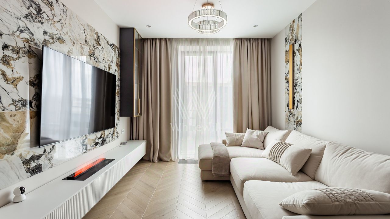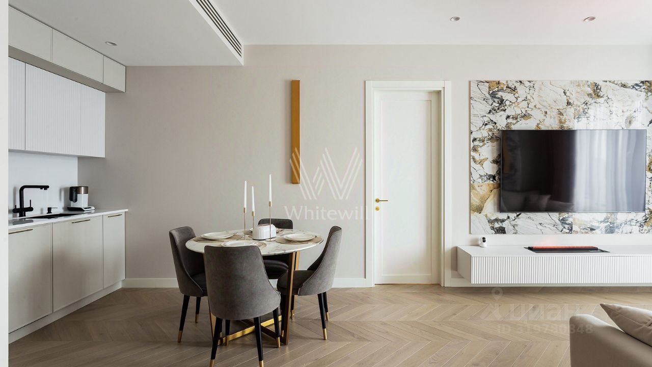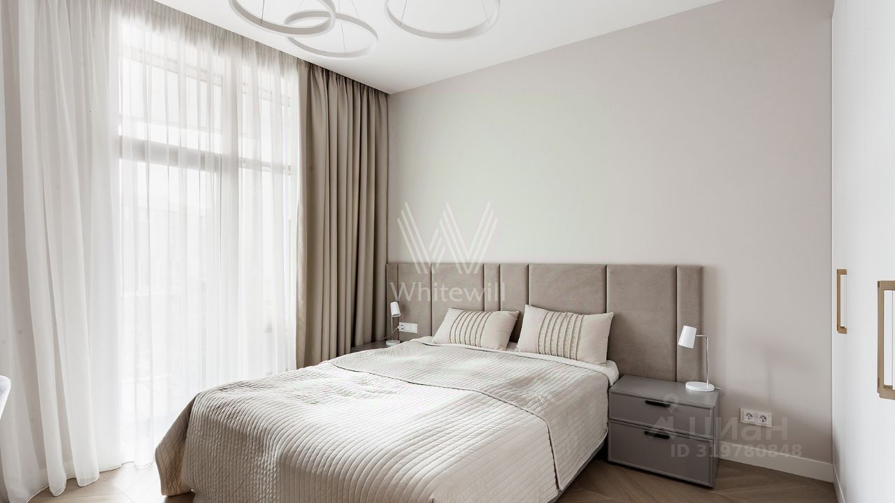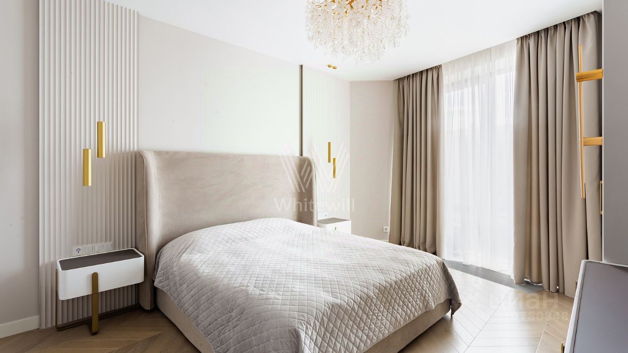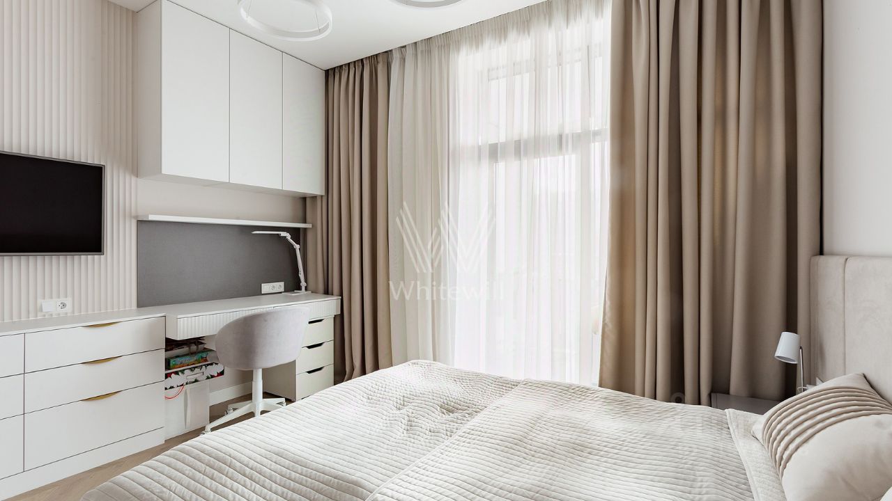 Дизайнерская квартира с двумя спальнями в комплексе премиум-класса ''Сколково Парк''. Квартира площадью 80 м² расположена на 6-м этаже в корпусе 6. Выполнена дизайнерская отделка в неоклассическом стиле с использованием высококачественных материалов: премиальная английская краска Little Green, паркетный пол гармонирует с дубовыми дверьми Union. Электроприводы позволяют регулировать шторы бесшумно — со смартфона или через ''Алису''. Панорамные окна Schuco открывают вид в уютный двор.