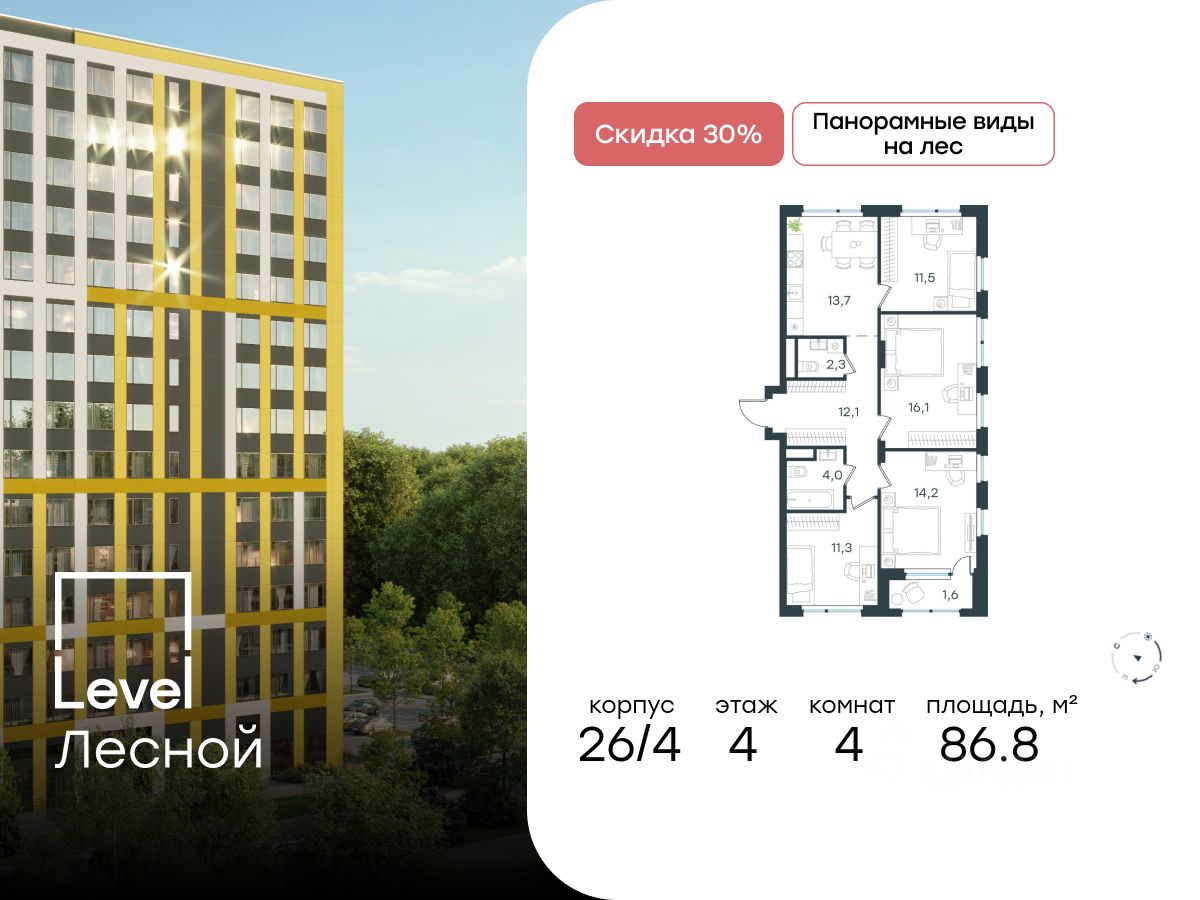 В районе, утопающем в густой зелени лесов, многочисленных парков и скверов, продаётся 4-комнатная квартира площадью 86.80 кв.м с отделкой white box. Квартира расположена на 4 этаже в жилом комплексе комфорт-класса Level Лесной (компания Level Group/Левел групп).