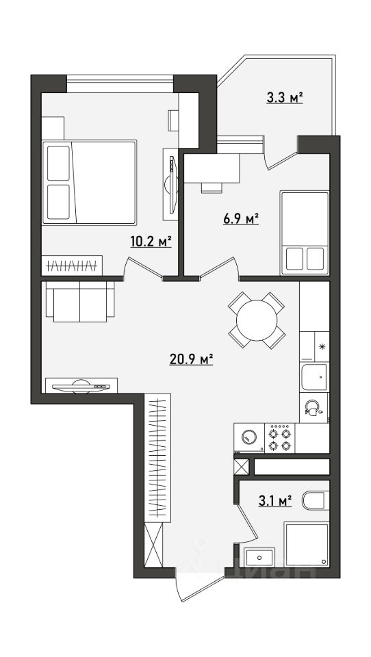 Общая плoщадь 41 м2. Кухня-гостиная 14 м2, комфортное зонирование кухни и зоны отдыха. Спальня 10 м2. Детская/кабинет 7 м2 с выходом на балкон. Санузел совмещенный 3.0 м2. Живописный вид из окон во внутренний двор.