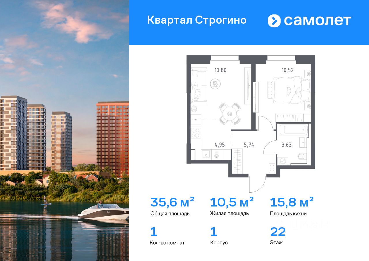 Предлагается 1-комнатная квартира комфорт-класса 35,64 кв.м в корпусе 1 на 22 этаже, в ЖК ''Квартал Строгино'' Квартира с чистовой отделкой. Доступность дополнительных опций уточняйте у застройщика.