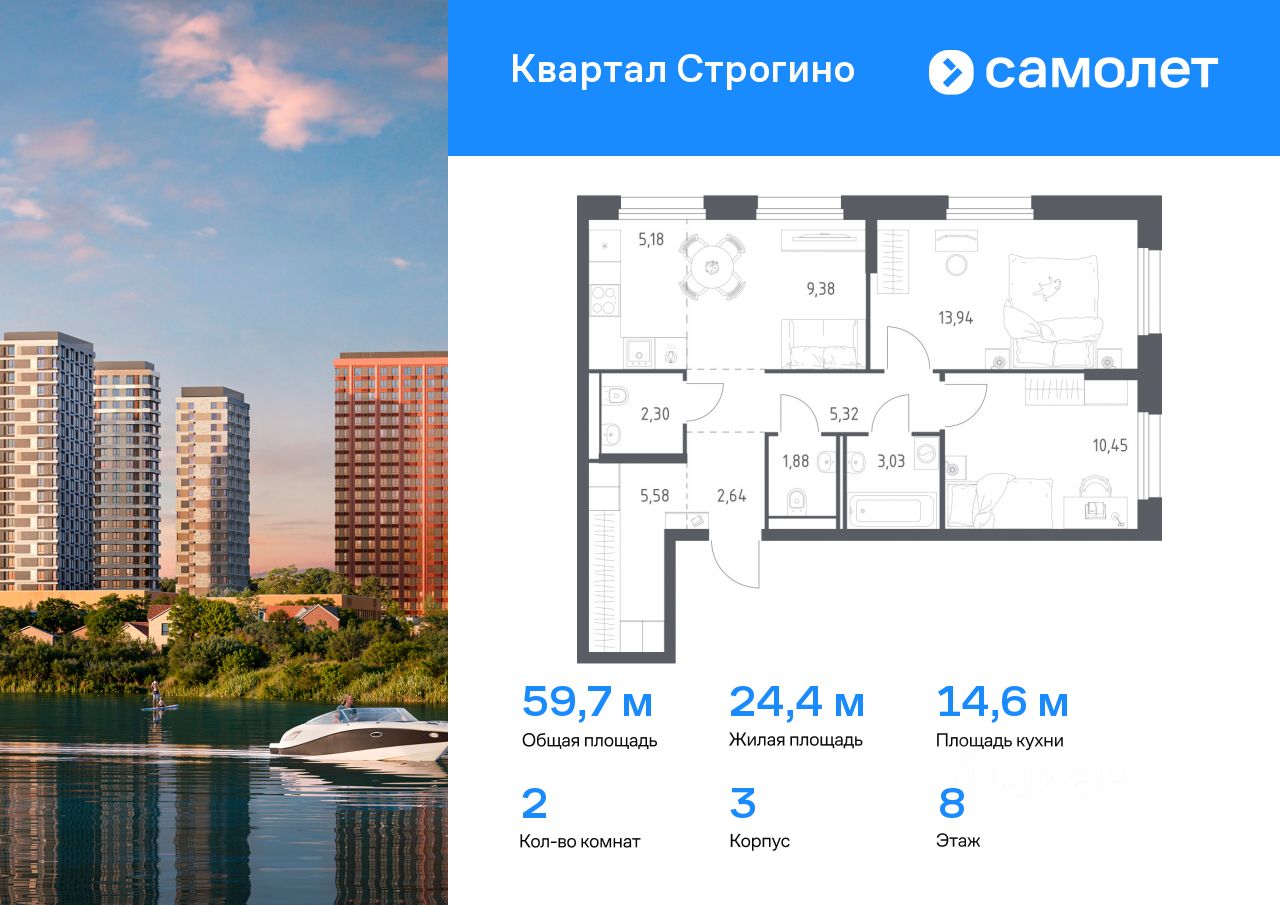 Предлагается 2-комнатная квартира комфорт-класса 59,7 кв.м в корпусе 3 на 8 этаже, в ЖК ''Квартал Строгино'' Квартира без отделки. Доступность опции ''отделка'' и возможность комплектации мебелью и декором уточняйте у застройщика.