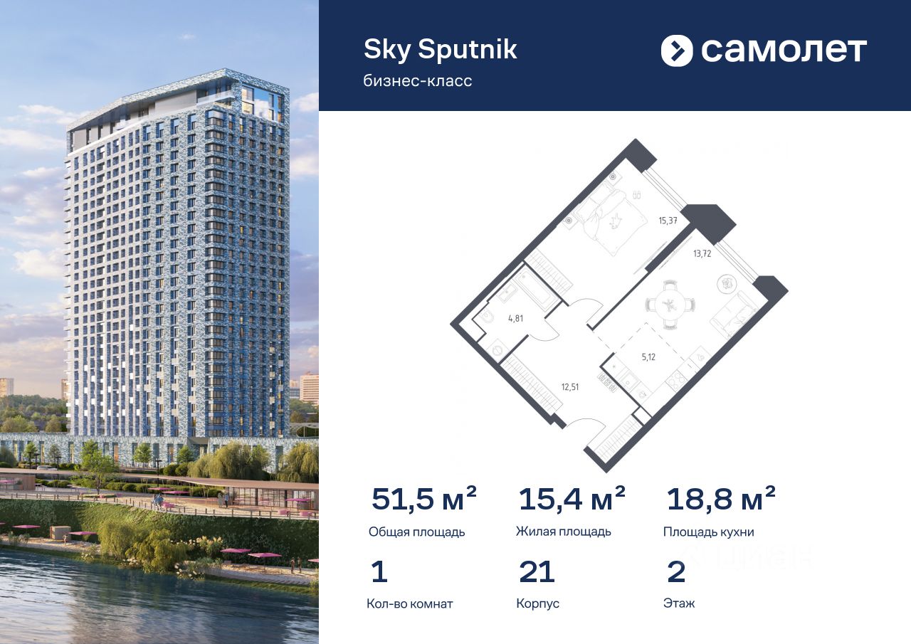Предлагаются 1-комнатные апартаменты бизнес-класса 51,53 кв.м в корпусе 21 на 2 этаже, в Sky Sputnik Апартаменты с чистовой отделкой. Доступность дополнительных опций уточняйте у застройщика.