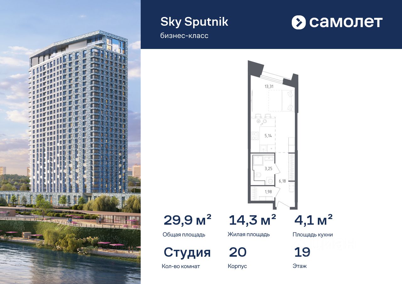 Предлагаются апартаменты студия бизнес-класса 29,86 кв.м в корпусе 20 на 19 этаже, в Sky Sputnik Апартаменты с предчистовой отделкой. Доступность дополнительных опций уточняйте у застройщика.