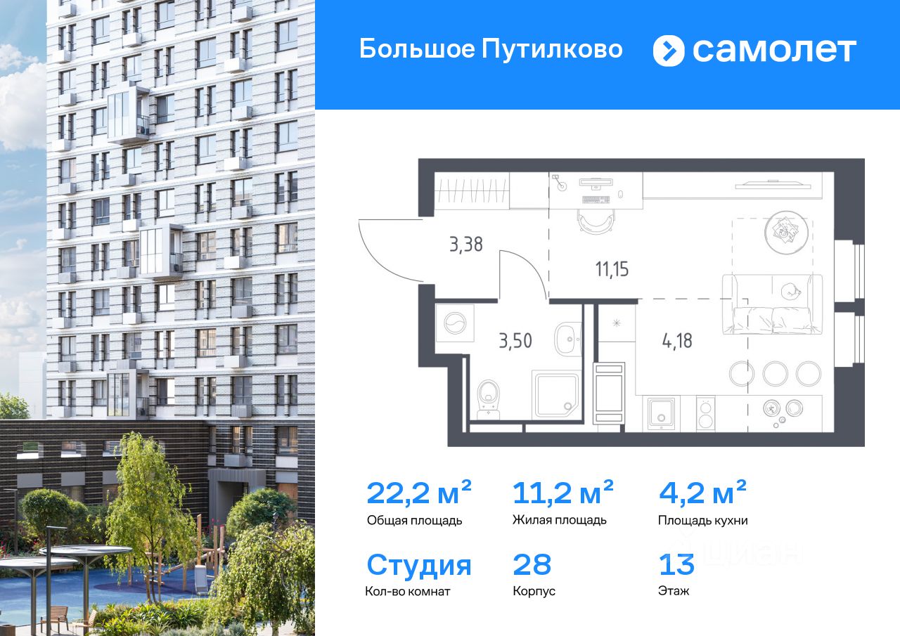 Предлагается квартира студия комфорт-класса 22,21 кв.м в корпусе 28 на 13 этаже, в ЖК ''Большое Путилково'' Квартира без отделки. Доступность опции ''отделка'' и возможность комплектации мебелью и декором уточняйте у застройщика.