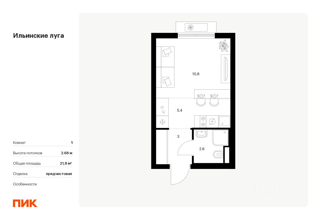 Продаётся квартира-студия площадью 21,8 кв.м на 7 этаже 9 этажного дома (Корпус 3.1, Секция 1) проекта ПИК Ильинские луга. Светлый просторный подъезд на уровне земли, функциональная планировка, большие окна, предчистовая отделка.