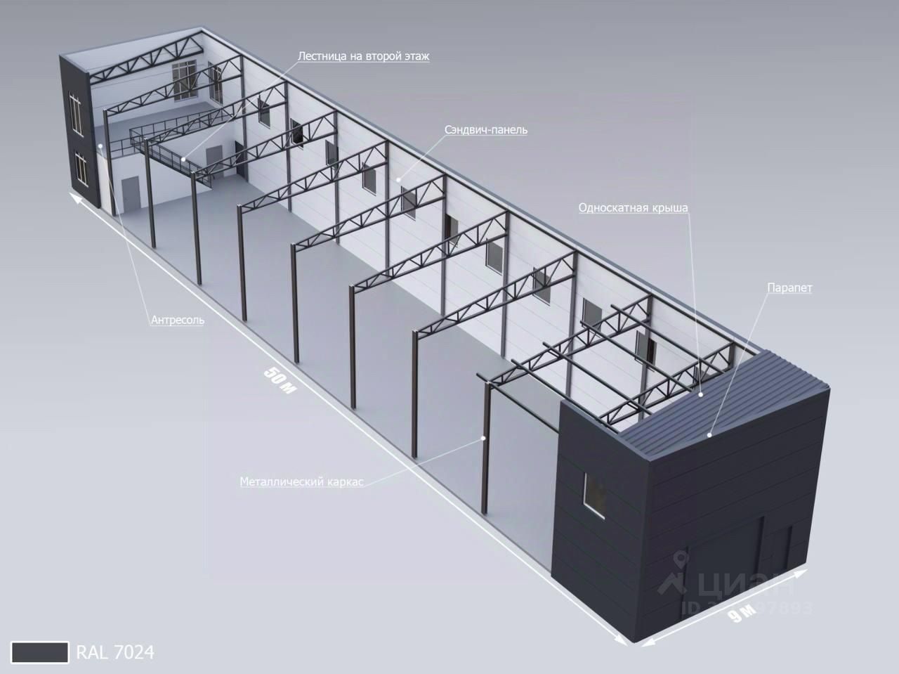 Главные преимущества • Свободная коробка 9 х 50 м без колонн — легко расставить паллетные стеллажи, установить сорт-линию или оборудование любой конфигурации. • Чистая высота 6 м — четыре уровня стеллажей или быстрый монтаж мезонина, во второй части уже готов 2-й этаж 50 м² для офиса, шоу-рума или комнат персонала.
