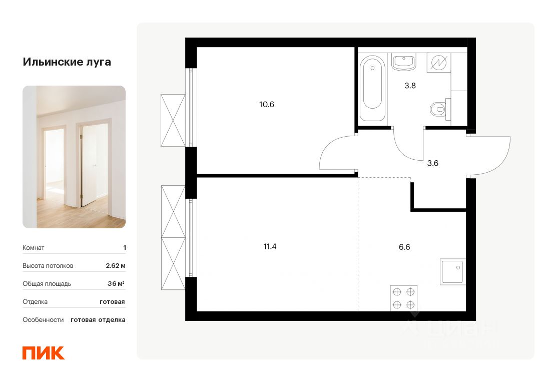 Продаётся 1-комн. квартира площадью 36 кв.м на 7 этаже 9 этажного дома (Корпус 2.8, Секция 5) проекта ПИК Ильинские луга. Светлый просторный подъезд на уровне земли, функциональная планировка, большие окна, c отделкой.