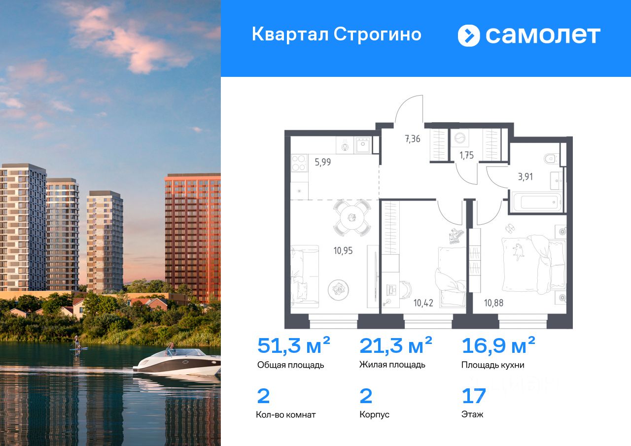 Предлагается 2-комнатная квартира комфорт-класса 51,26 кв.м в корпусе 2 на 17 этаже, в ЖК ''Квартал Строгино'' Квартира без отделки. Доступность опции ''отделка'' и возможность комплектации мебелью и декором уточняйте у застройщика.