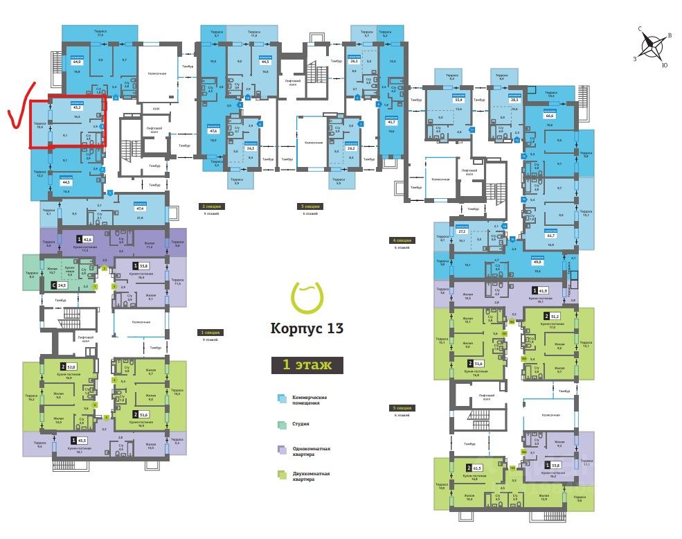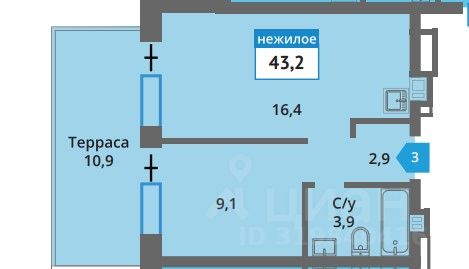 Сдается коммерческое помещение 43,2 м. в строящемся корпусе 13 (планируется к сдаче октябрь 25г.). Помещение без ремонта, панорамное остекление, терраса 10,9м.