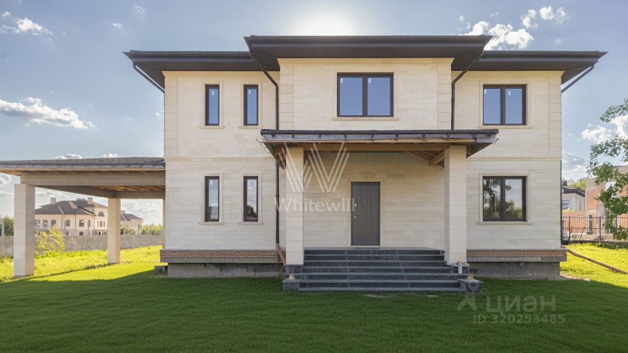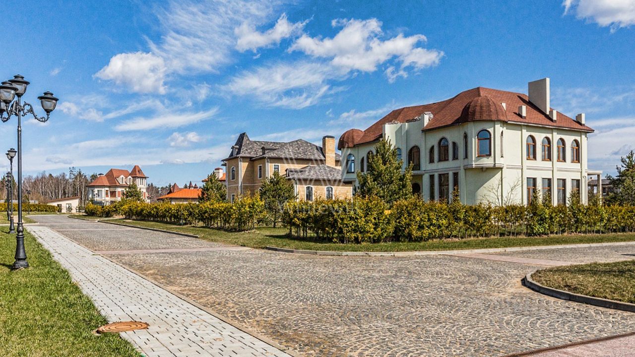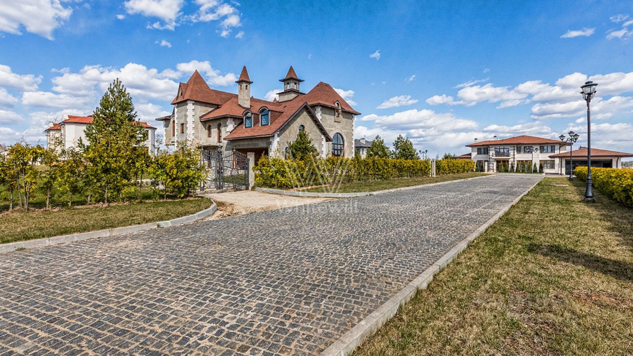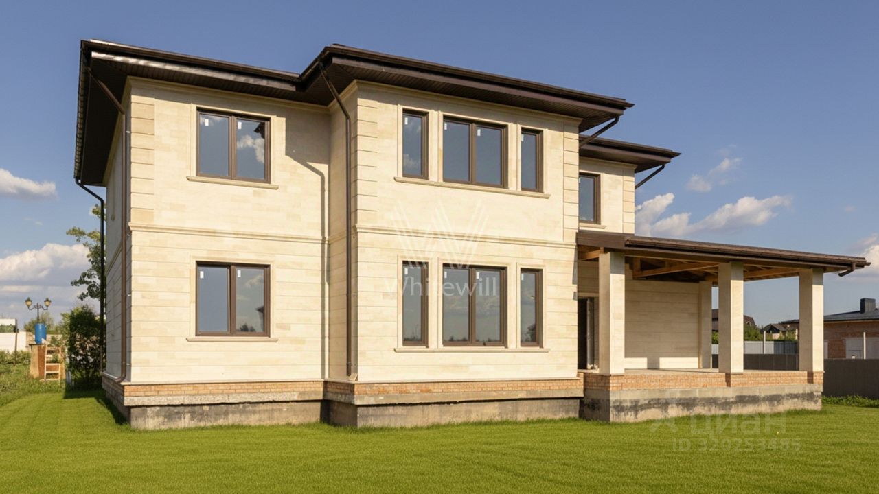 Шато Соверен. Загородный дом площадью 335 м² расположен на полевом участке 20,5 сотки в тихой части поселка. Фасад здания облицован бежевым песчаником, установлены двухкамерные стеклопакеты Rehau с отражающим серебросодержащим покрытием. В коттедже без отделки спланировали 5 спален, гостиную со вторым светом, кухню-столовую, кабинет и просторную террасу. К зданию пристроен навес для машины. На участке можно выполнить ландшафтный дизайн и обустроить зону барбекю.