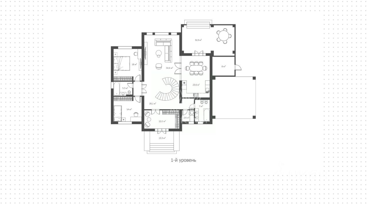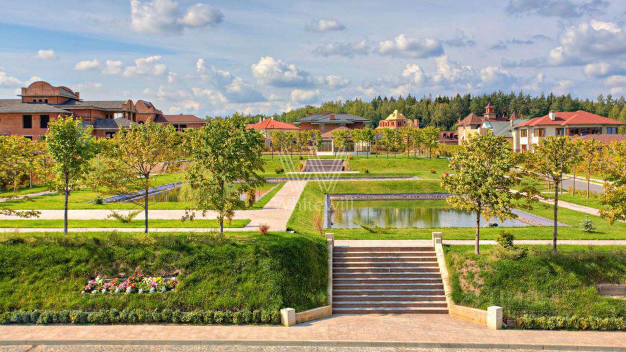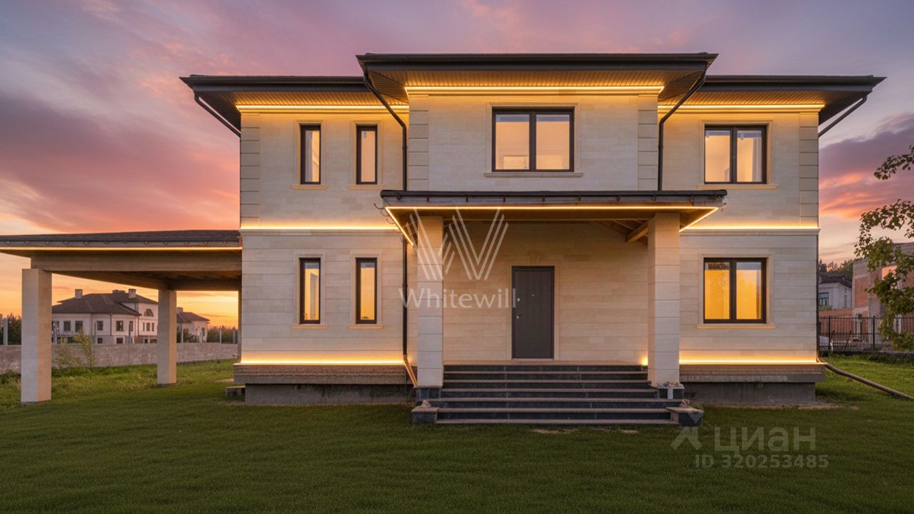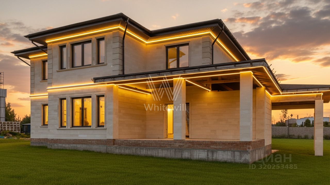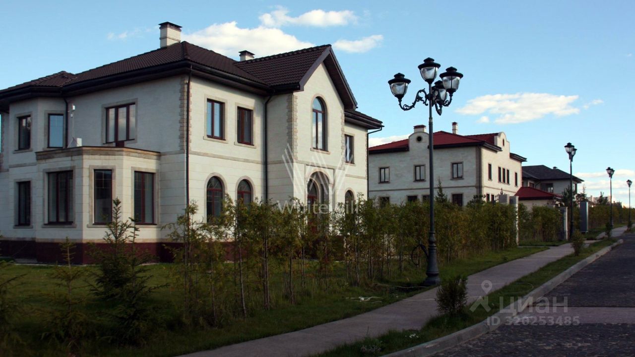 Шато Соверен. Загородный дом площадью 335 м² расположен на полевом участке 20,5 сотки в тихой части поселка. Фасад здания облицован бежевым песчаником, установлены двухкамерные стеклопакеты Rehau с отражающим серебросодержащим покрытием. В коттедже без отделки спланировали 5 спален, гостиную со вторым светом, кухню-столовую, кабинет и просторную террасу. К зданию пристроен навес для машины. На участке можно выполнить ландшафтный дизайн и обустроить зону барбекю.