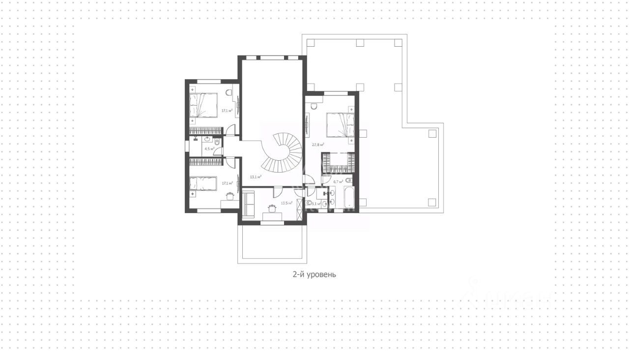 2-й уровень: холл, 2 спальни, санузел, кабинет с санузлом, спальня с гардеробным и санузлом.