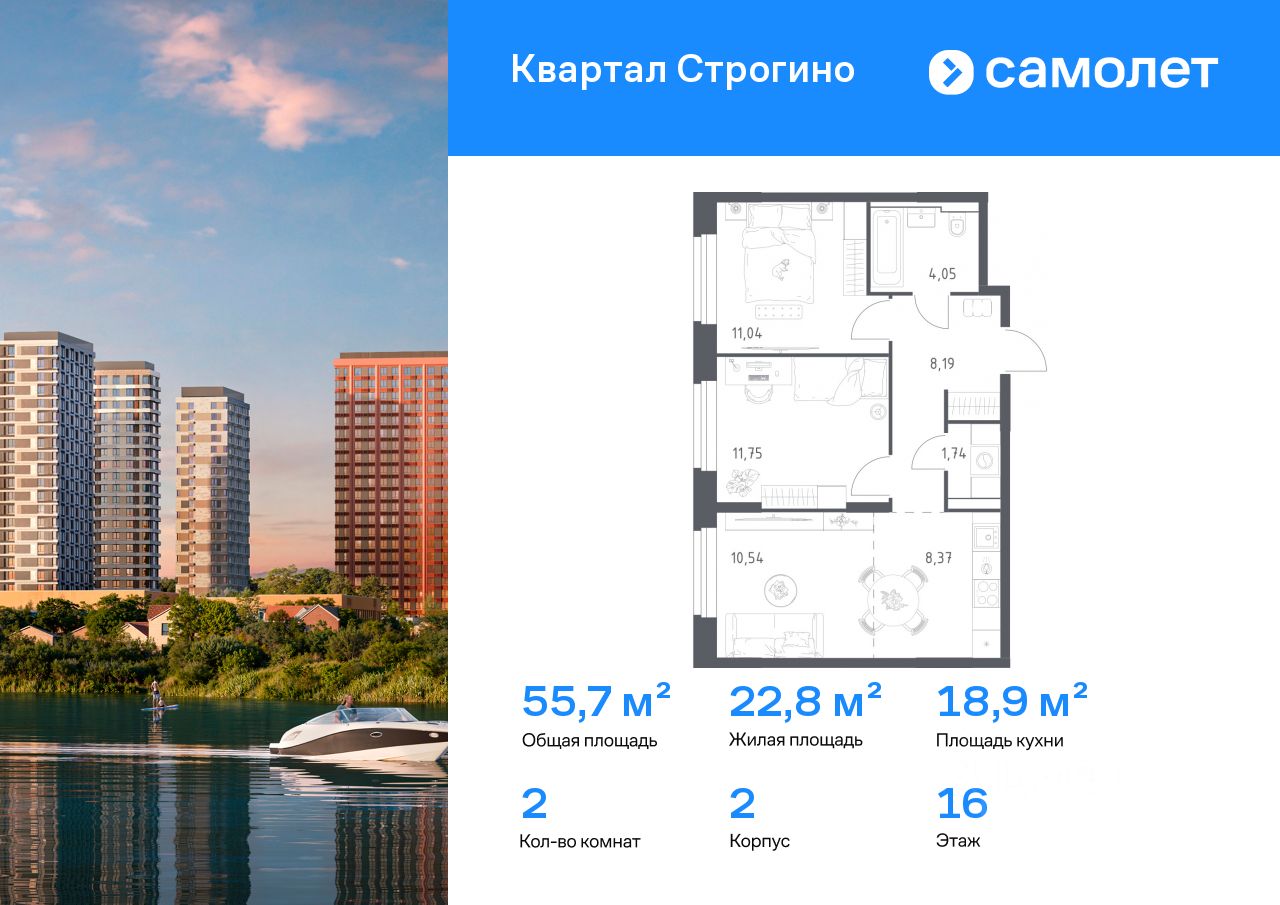 Предлагается 2-комнатная квартира комфорт-класса 55,68 кв.м в корпусе 2 на 16 этаже, в ЖК ''Квартал Строгино'' Квартира с чистовой отделкой. Доступность дополнительных опций уточняйте у застройщика.