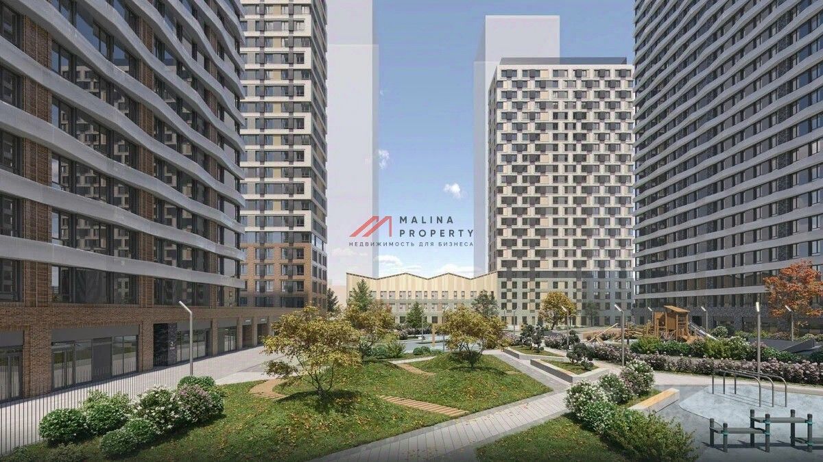 Помещение располагается на первой линии жилого комплекса, в центре жилого массива. Рядом с помещением будет находиться супермаркет, школа и детский сад.