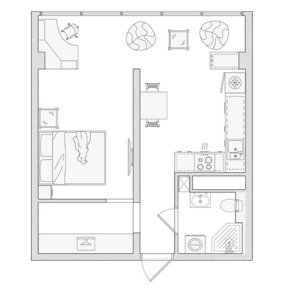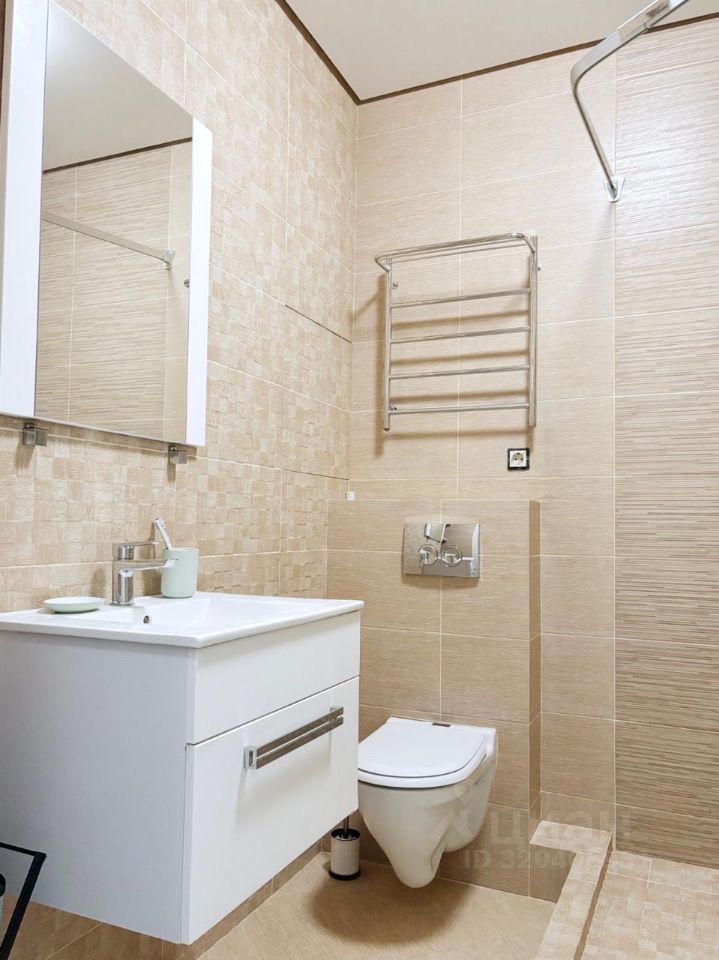 В квартире выполнен качественный ремонт. Все необходимое для комфортного проживания уже есть: современная мебель в комнате и на кухне, а также вся необходимая техника — кондиционер, холодильник и стиральная машина. Планировка продумана до мелочей, что позволяет максимально эффективно использовать пространство. Санузел совмещенный, оборудован душевой зоной.
