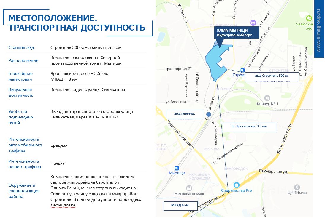 Ярославское шоссе 3,5 км., МКАД 8 км. Въезд автотранспорта со стороны улицы Силикатная. ст. ''Строитель'' - 5 мин. ст. ''Мытищи'' - 15 мин. Режим работы Индустриального парка ''ЭЛМА-МЫТИЩИ'' - 24/7. На территории комплекса осуществляется круглосуточная охрана: КПП, огороженная территория. На объекте расположена столовая, вендинговые аппараты, кафе.