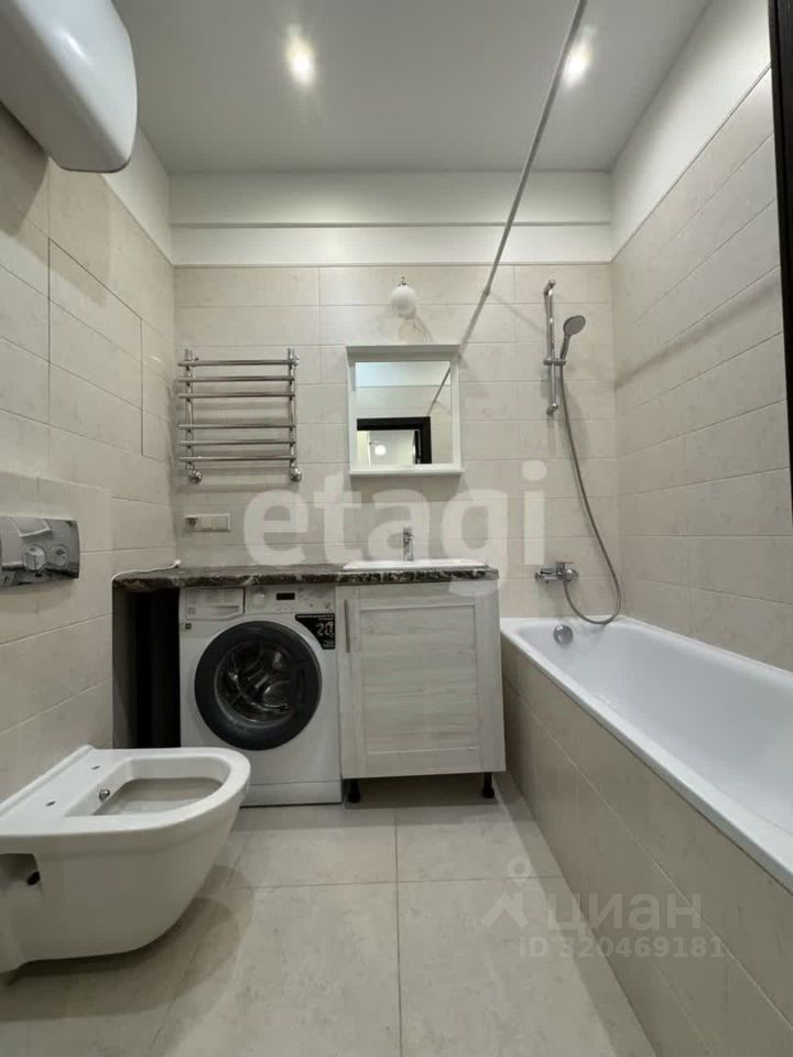 В квартире совмещенный санузел с новой стиральной машиной. В комнате есть кровать и диван. Кухонный стол был перенесен на кухню, также добавлены новые кухонные стулья. Вся техника на кухне новая.
