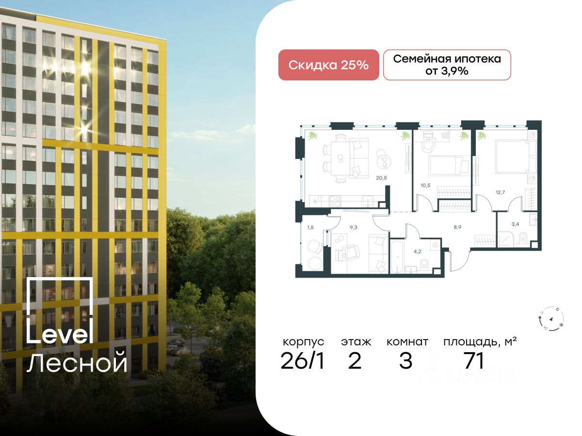 В районе, утопающем в густой зелени лесов, многочисленных парков и скверов, продаётся 3-комнатная квартира площадью 71.00 кв.м с отделкой white box. Квартира расположена на 2 этаже в жилом комплексе комфорт-класса Level Лесной (компания Level Group/Левел групп).